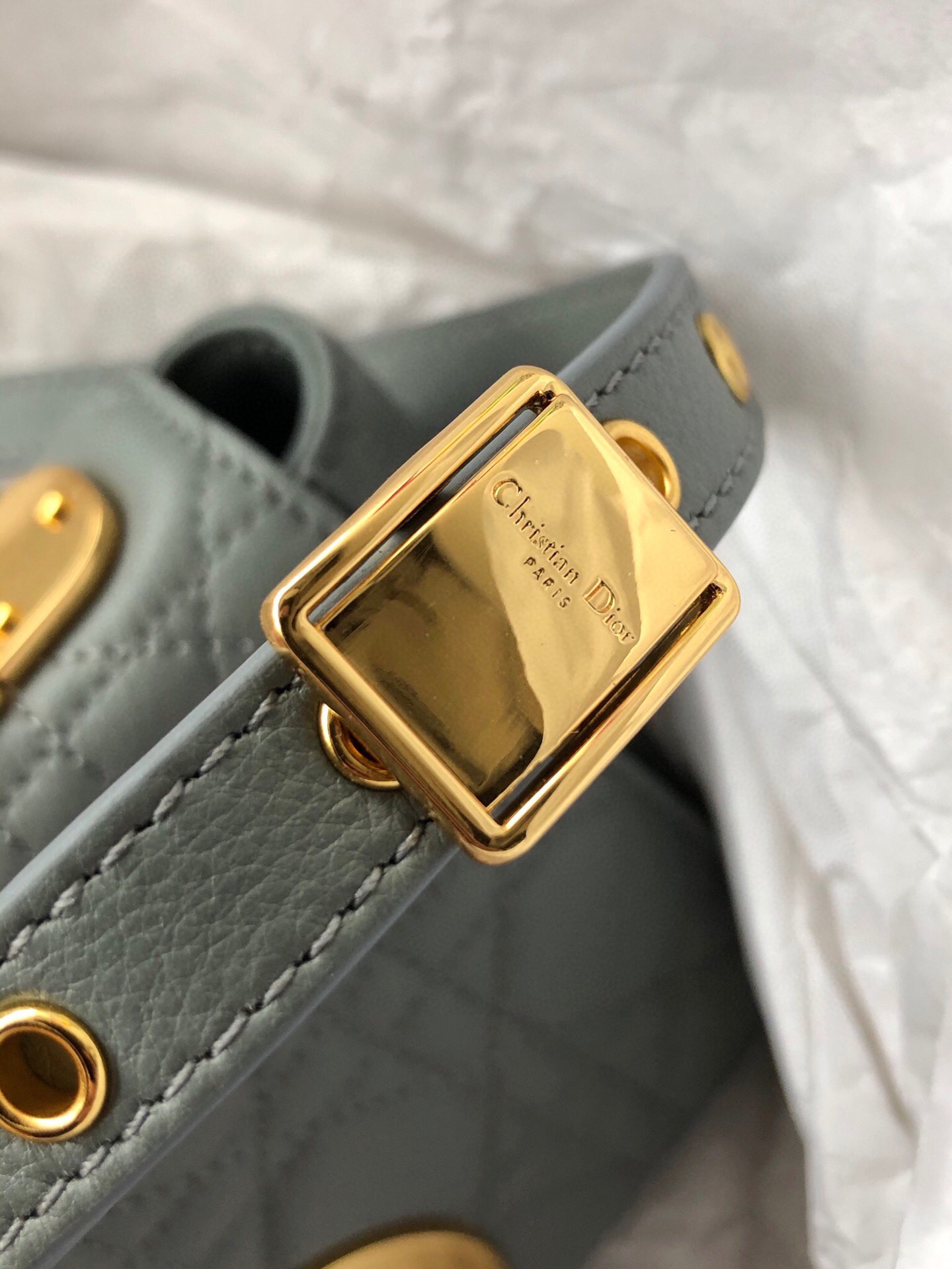 This is an authentic CHRISTIAN DIOR Calfskin Cannage Small Caro Bag in Grey. This flap bag is finely crafted of calfskin cannage quilted leather in grey. The bag features an adjustable shoulder strap and polished gold hardware. It opens to a smooth leather interior with zipper and patch pockets.