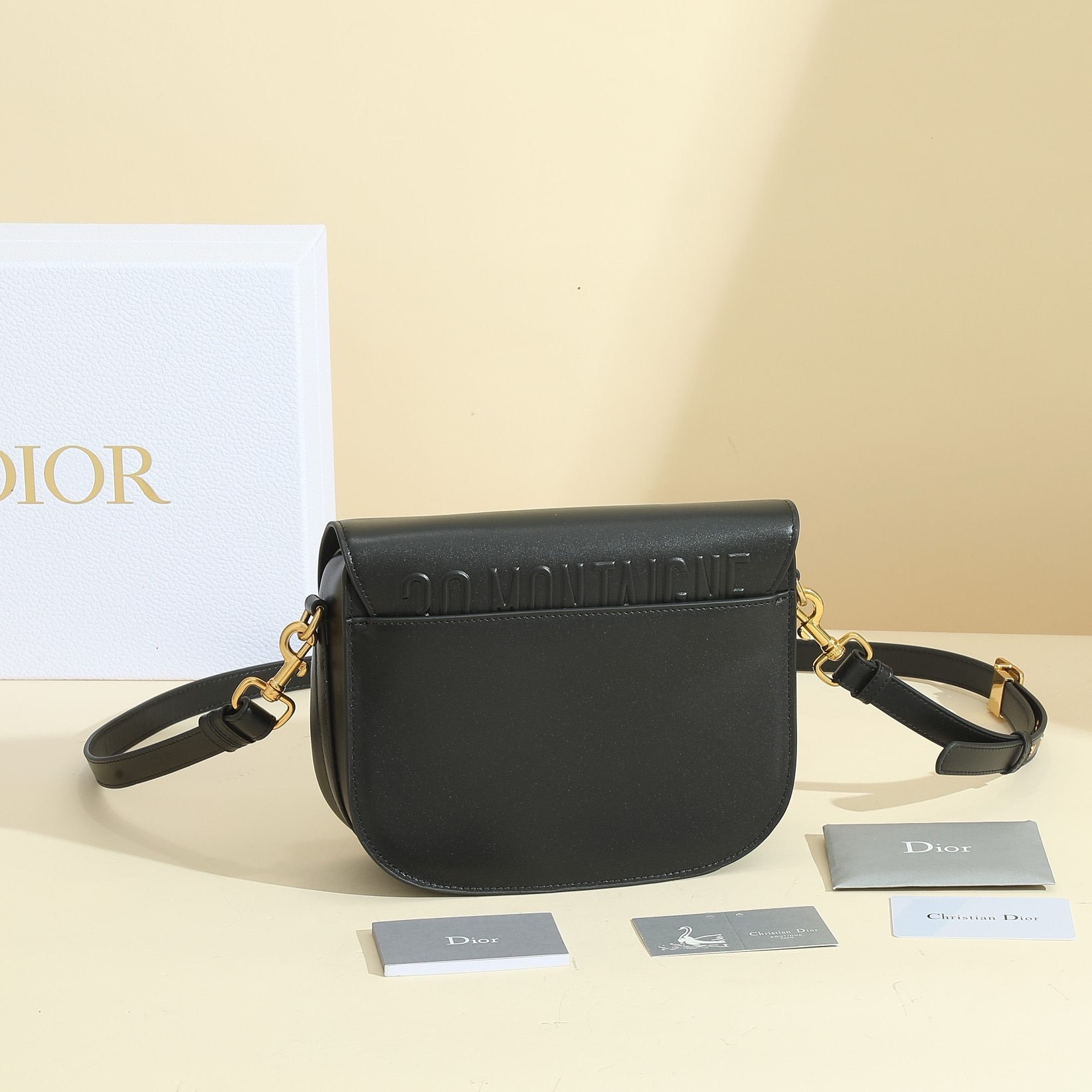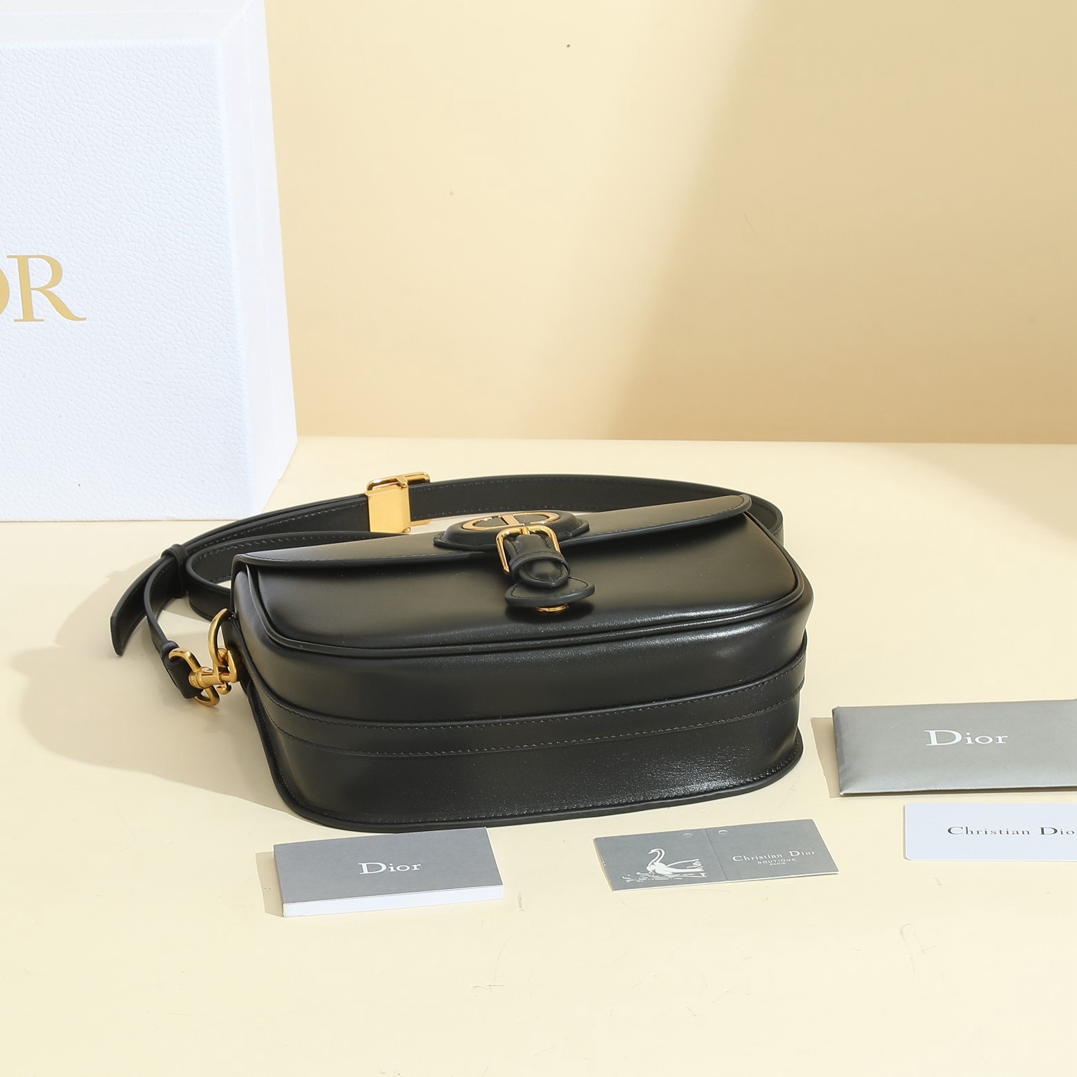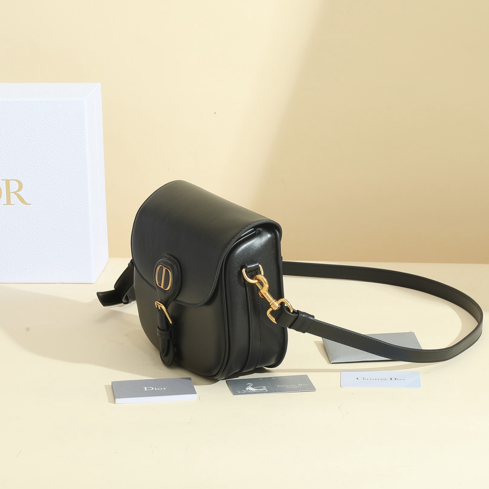 • Inspired by a Marc Bohan creation from the House archives, Maria Grazia Chiuri’s Dior Bobby Frame bag is an elegant style with retro charm. Crafted in black box, the design is distinguished by a gusseted silhouette, flap closure and antique gold-finish metal details. Adorned with a removable, adjustable sliding shoulder strap with a military-inspired buckle, the Dior Bobby Frame bag can be carried by hand, worn over the shoulder or crossbody.