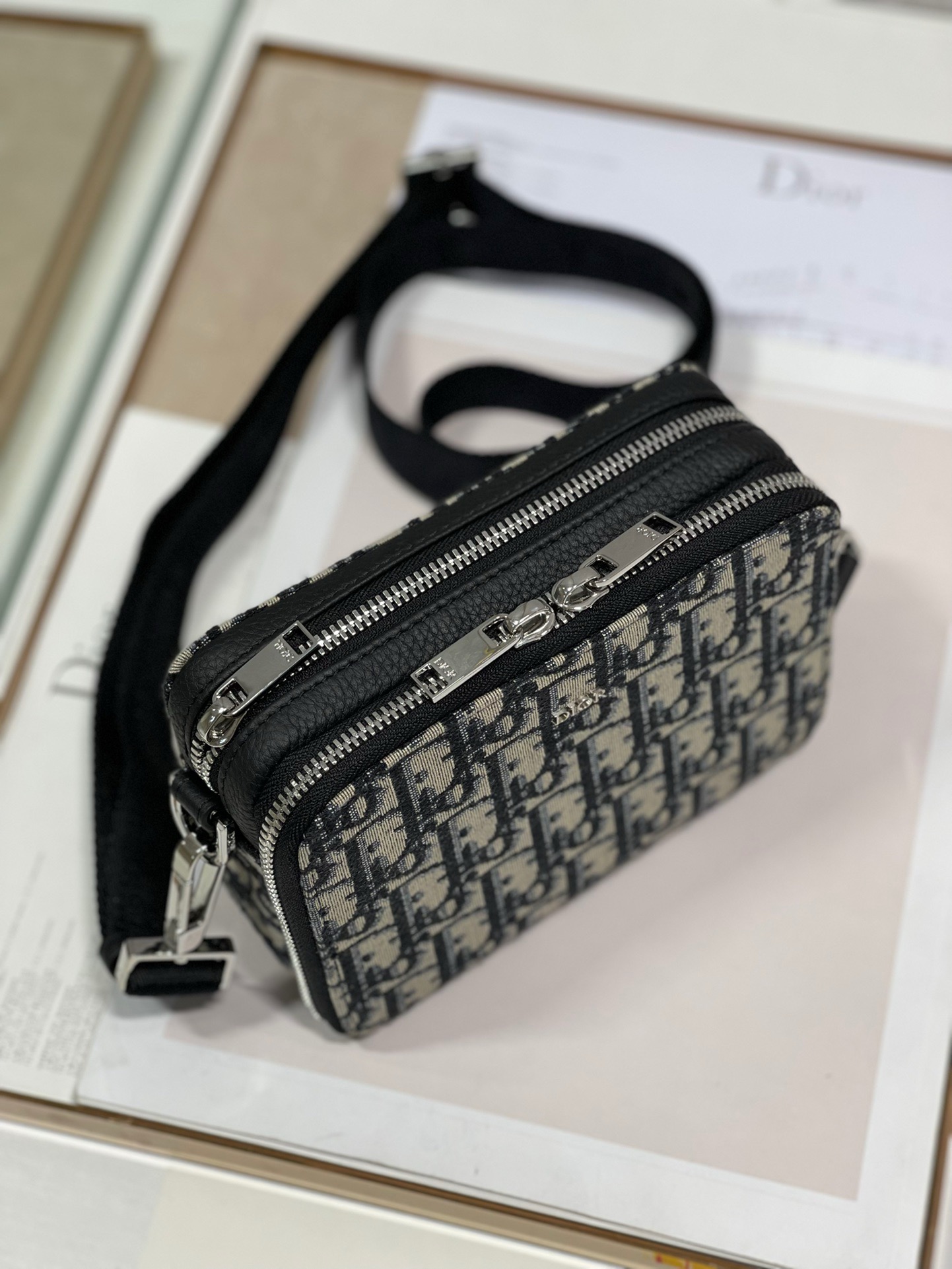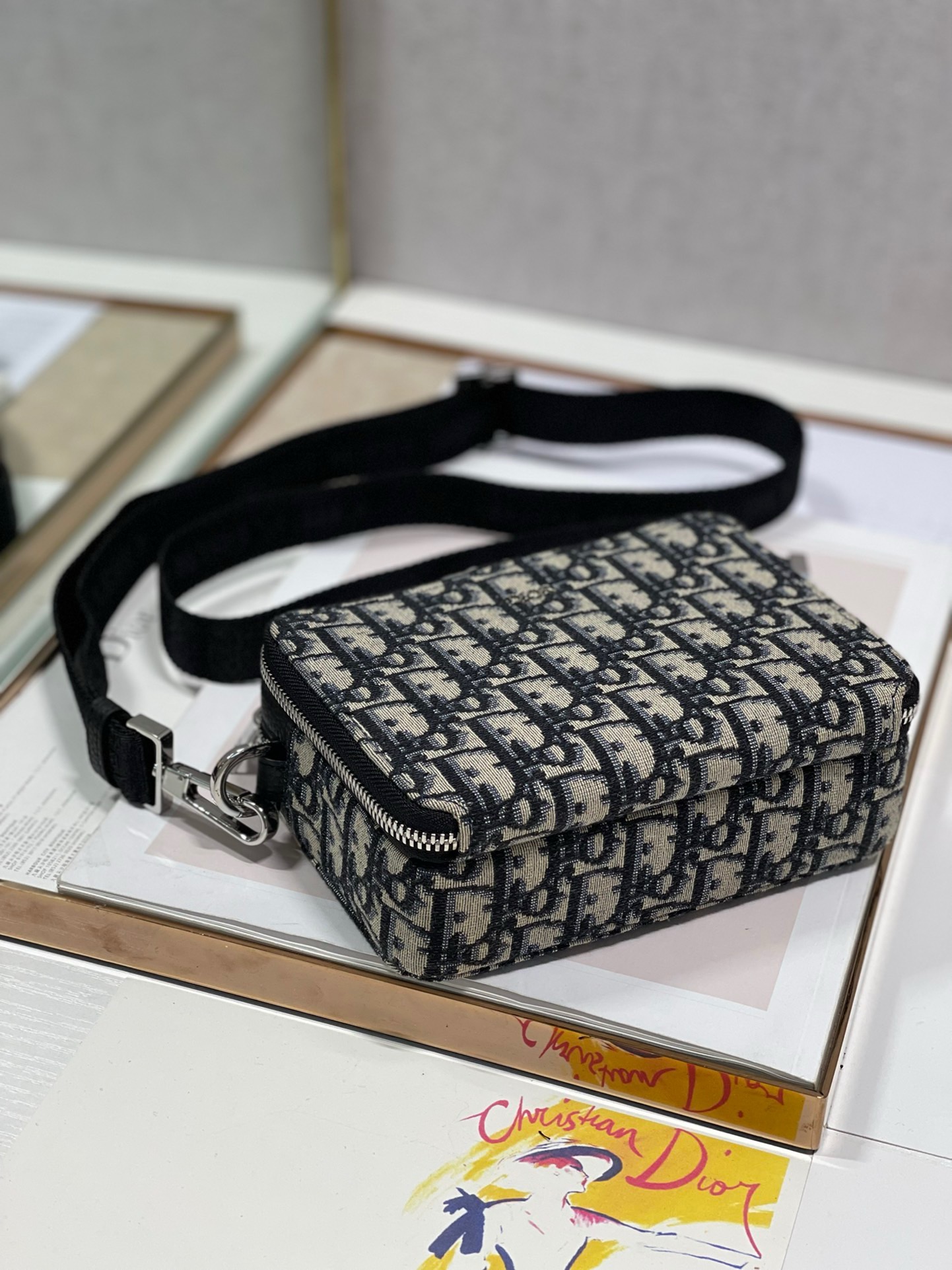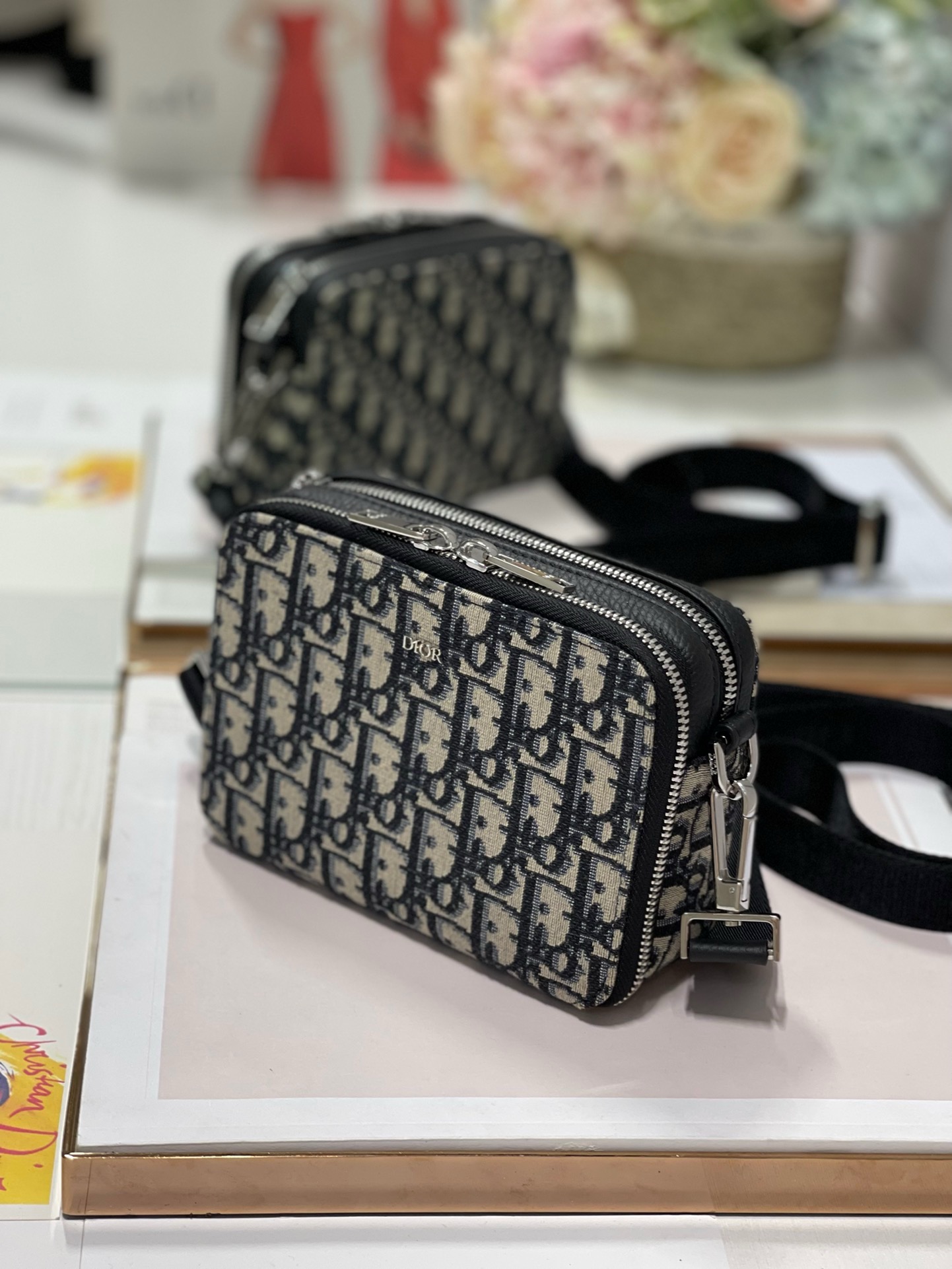 - The pouch pays tribute to the Dior Oblique motif, first showcased on the House’s creations in 1967. Crafted in beige and black jacquard, it features a two-way zipped closure at the top and a front pocket with three card slots. A black adjustable and removable shoulder strap adorned with the ‘Christian Dior’ signature and made with technical fabric jacquard is completed by two ruthenium-finish brass snap hooks. An embossed ‘DIOR’ signature is present on the streamlined and spacious interior with a patch pocket to safely hold your essentials. The pouch is a modern piece that will add a touch of elegance to any outfit.