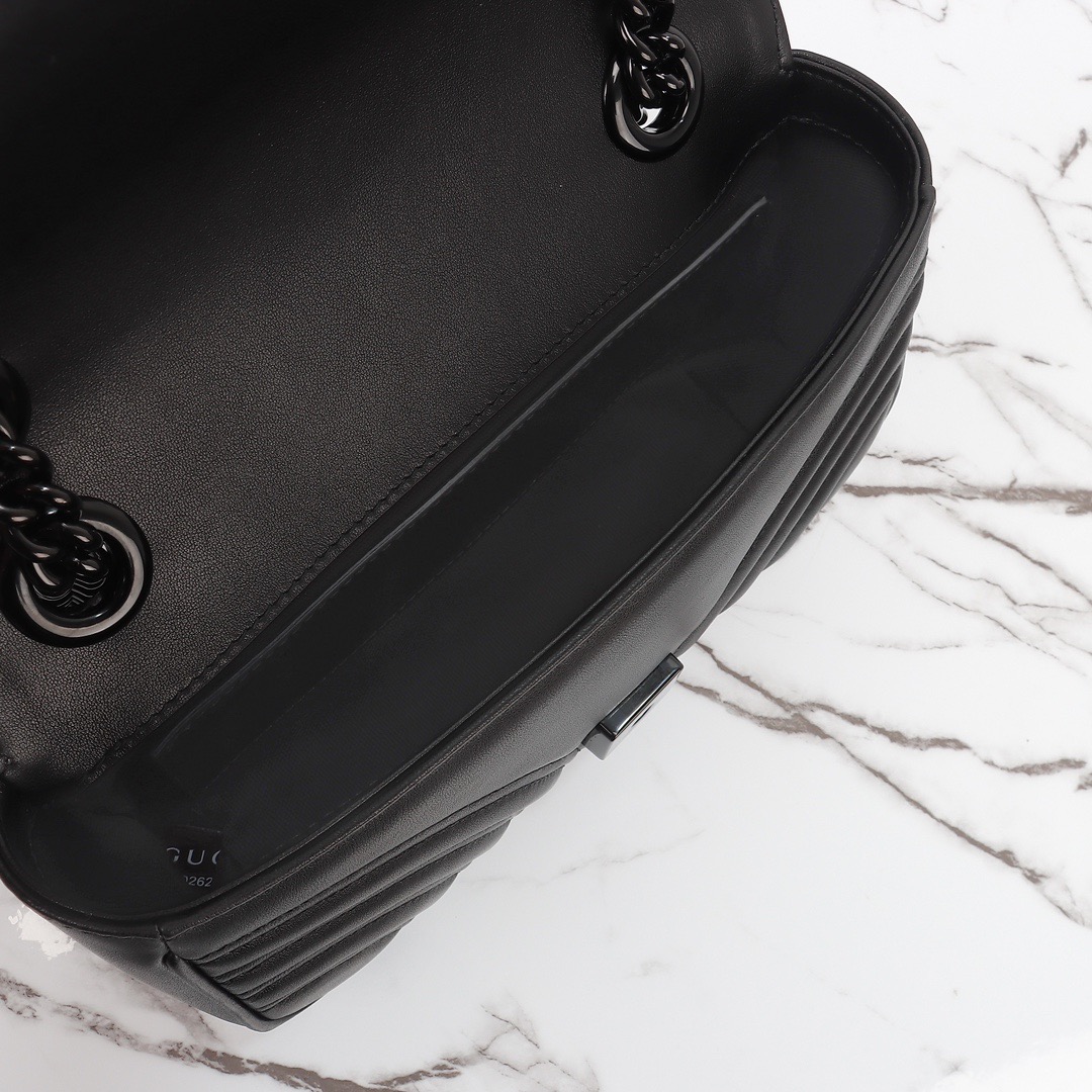 he mini GG Marmont chain shoulder bag has a softly structured shape and an oversized flap closure with Double G hardware. The sliding chain strap can be worn multiple ways, changing between a shoulder and a top handle bag. Made in matelassé chevron leather, the accessory is introduced for Gucci Love Parade with monochrome hardware.
