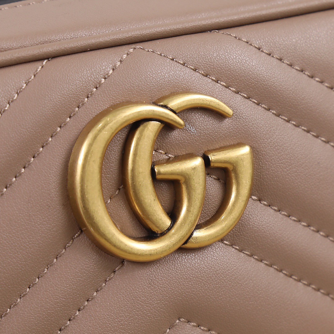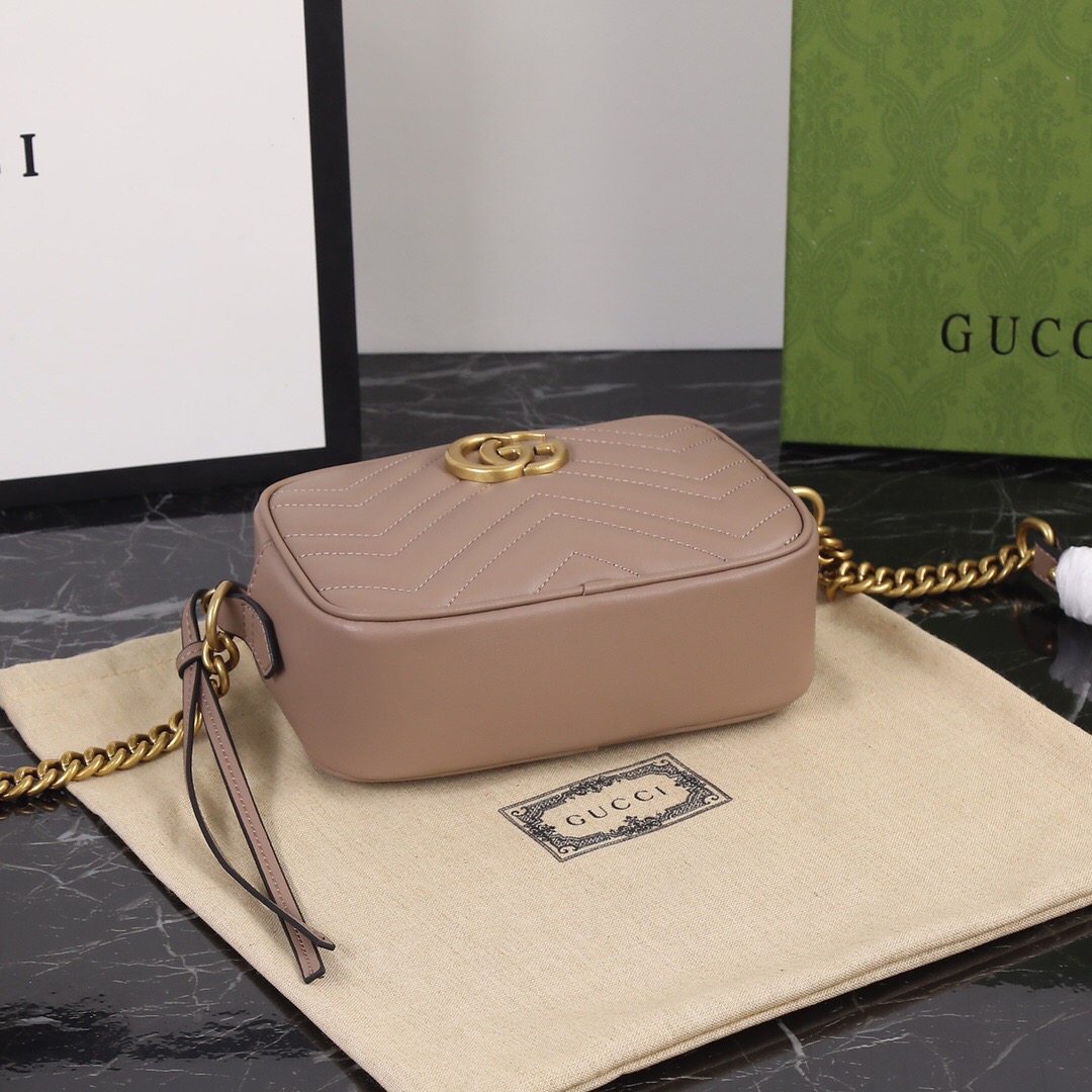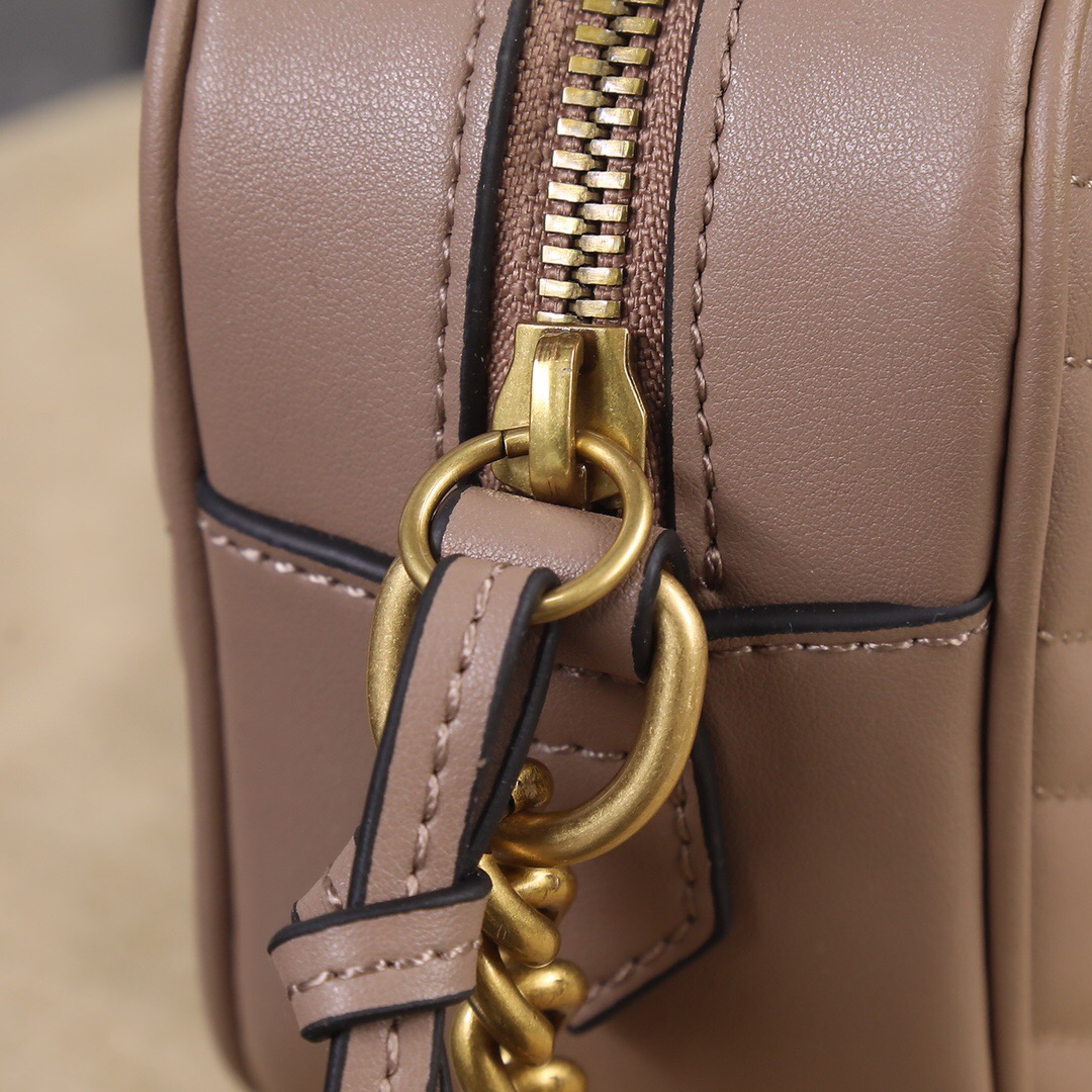 The mini GG Marmont chain shoulder bag has a softly structured shape and a zip top closure with Double G hardware. The chain strap has a leather shoulder detail. The camera bag is made in matelassé leather with a chevron design and GG on the back.