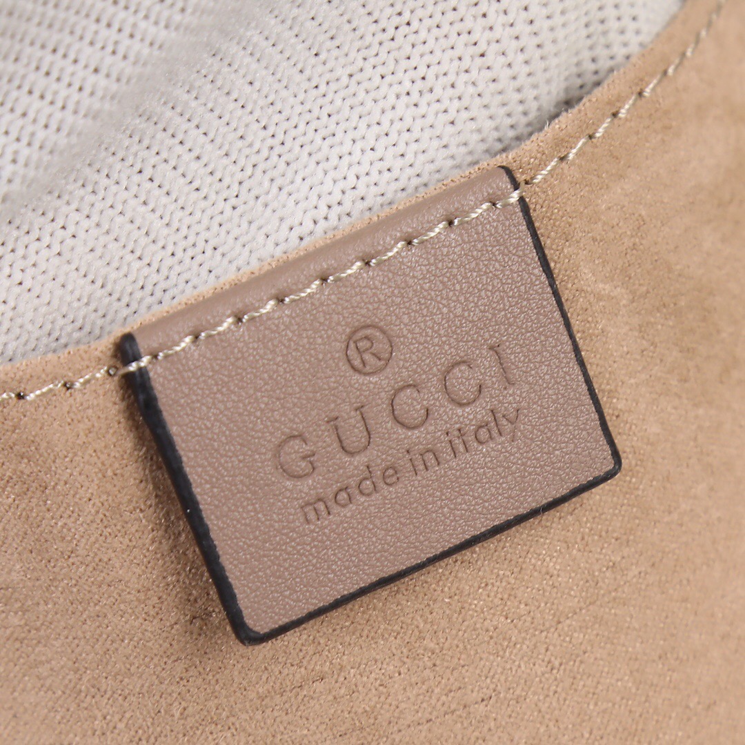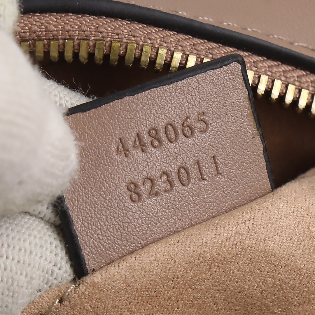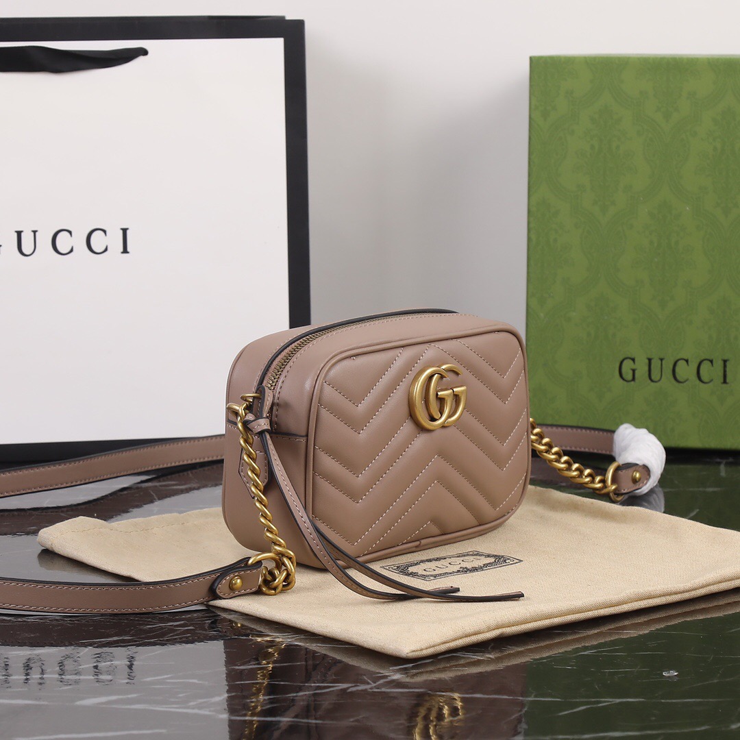 The mini GG Marmont chain shoulder bag has a softly structured shape and a zip top closure with Double G hardware. The chain strap has a leather shoulder detail. The camera bag is made in matelassé leather with a chevron design and GG on the back.