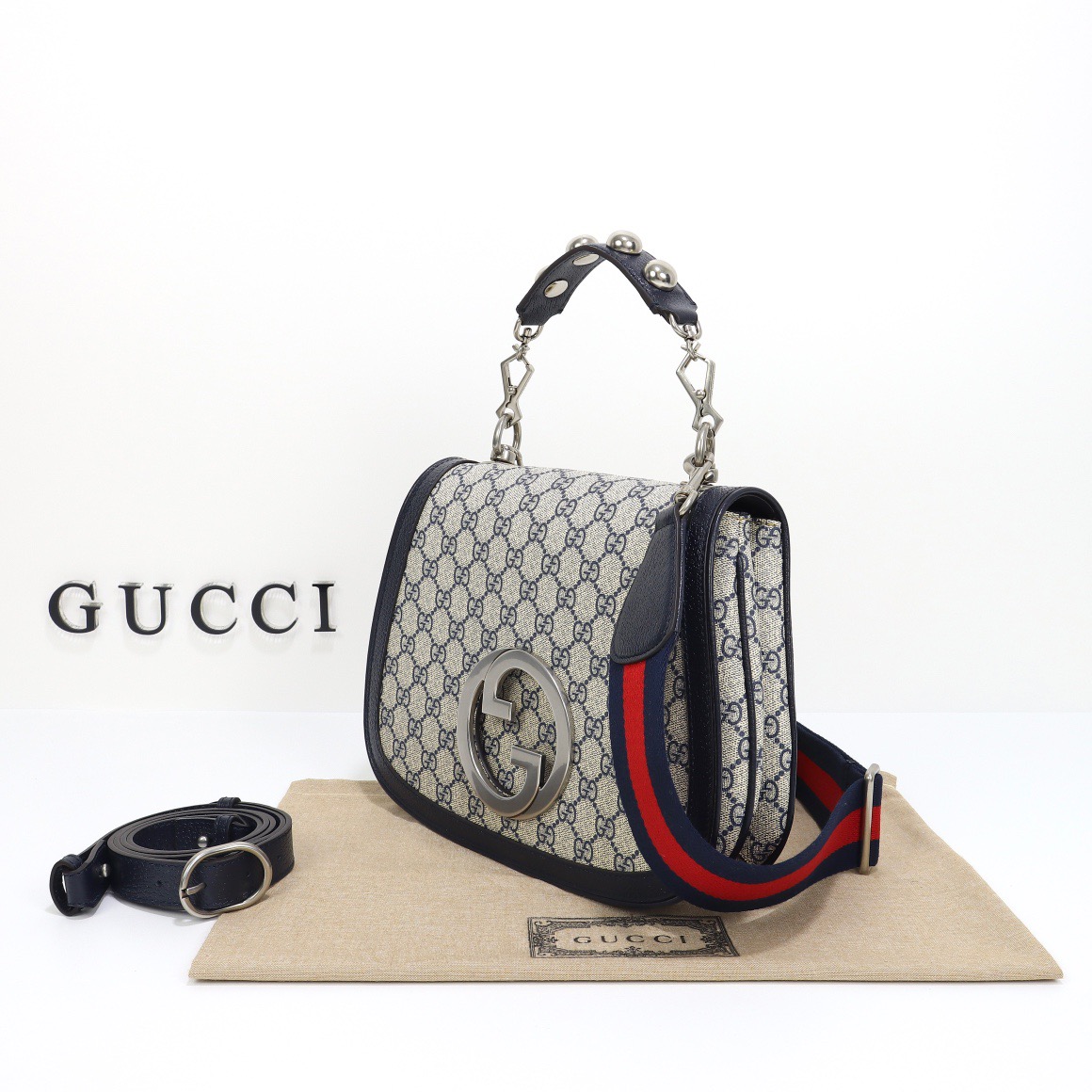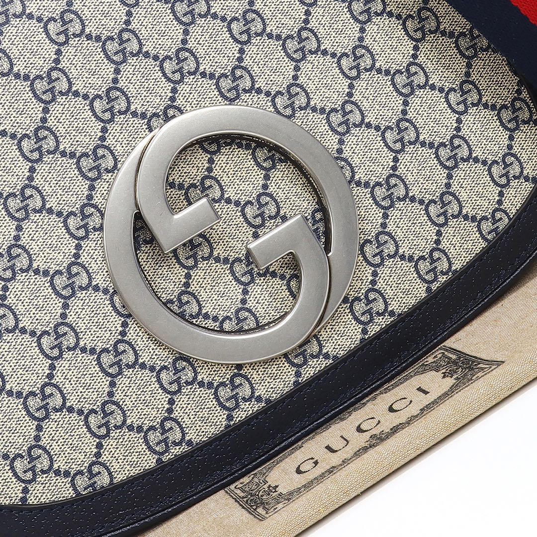 Coming from the House's archives, a geometrically shaped version of the Interlocking G logo comes to the fore. The gold-toned hardware adds a defined vintage feel to the style, enriching the design with a timeless feel—mirroring the Hollywood glamour that shaped the fashion show. The top handle bag is completed by two interchangeable straps, one with stud details.