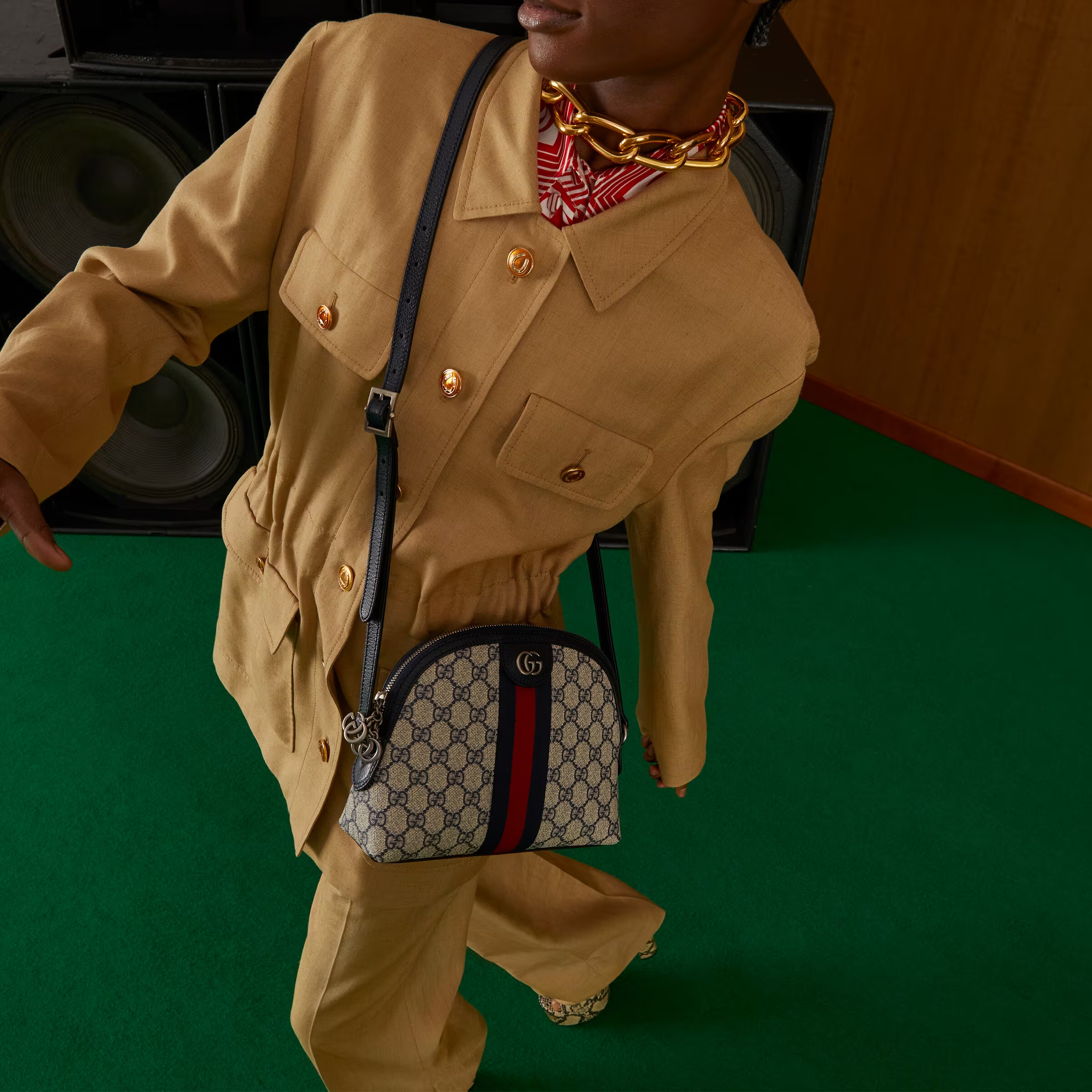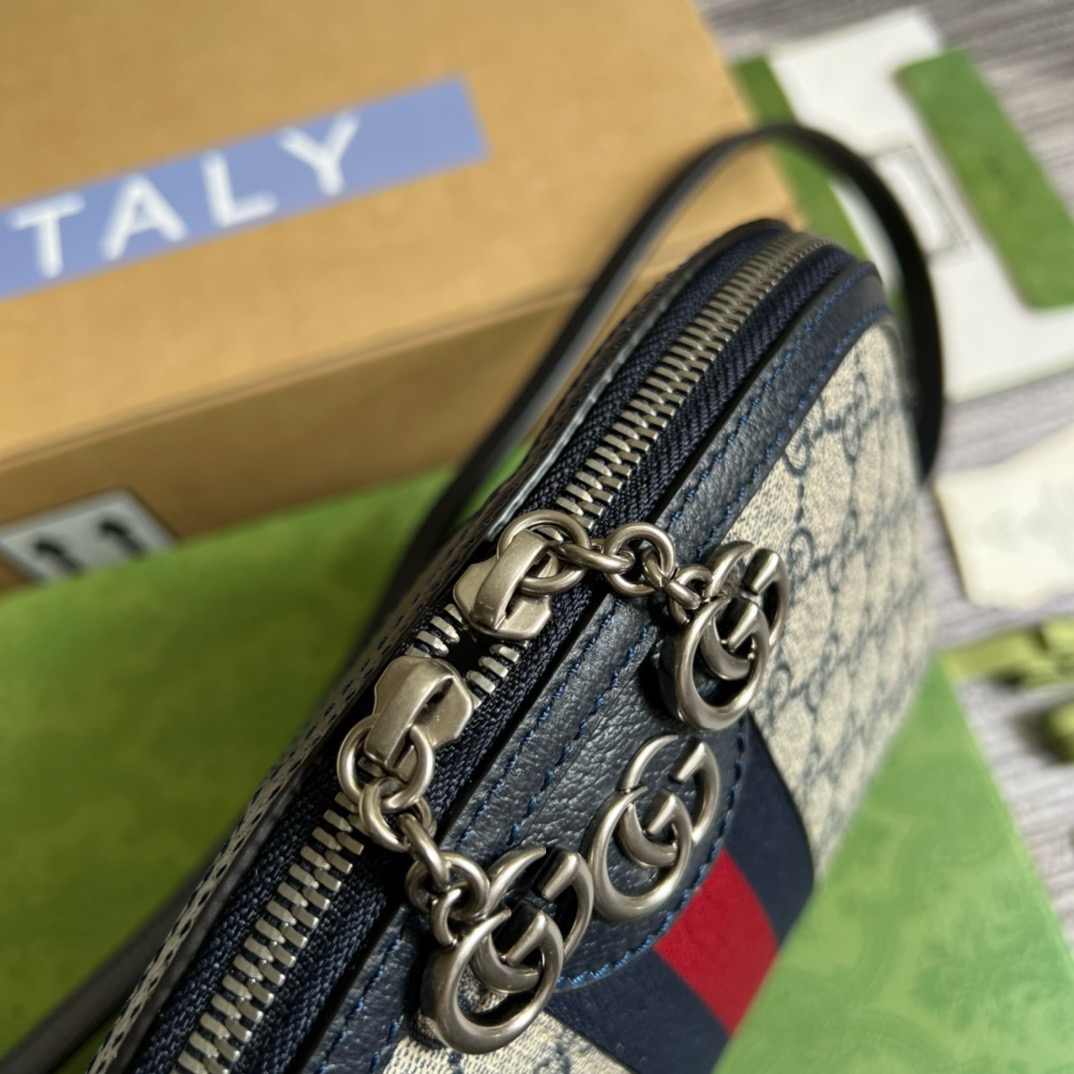 Mirroring the material's historic origins, GG Supreme is introduced in a timeless mix of blue and beige for Gucci Love Parade. The canvas has come to the front of each collection decade after decade to become a hallmark of the House. Here, the classic palette defines this small Ophidia shoulder bag.