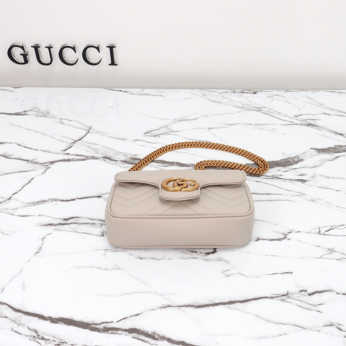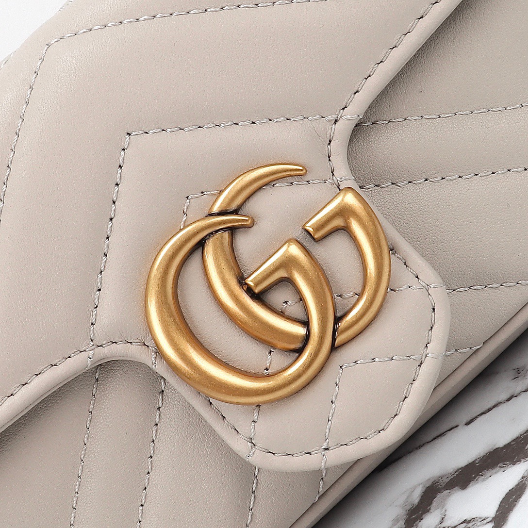 The GG Marmont mini bag in white matelassé leather is defined by its softly structured shape and a flap closure. The Double G defines the line, a three-dimensional detail inspired by an archival design from the '70s.