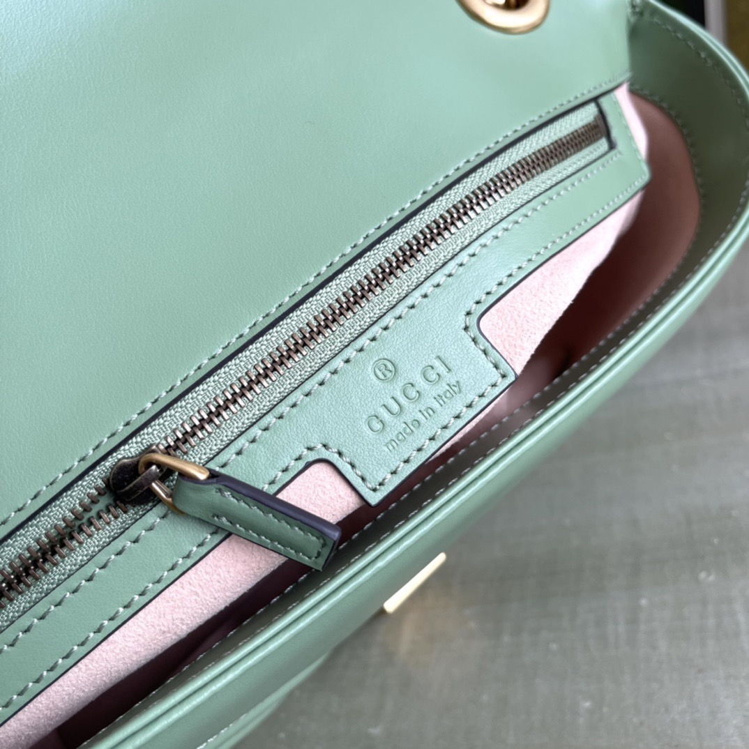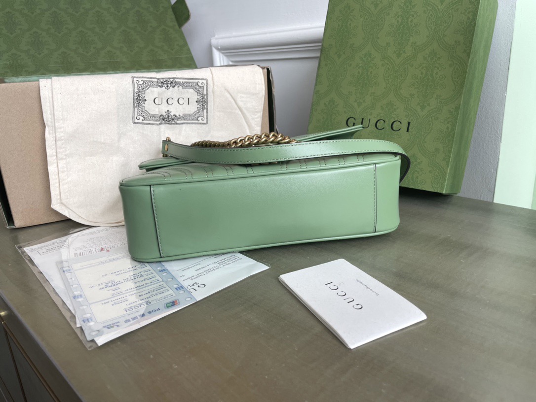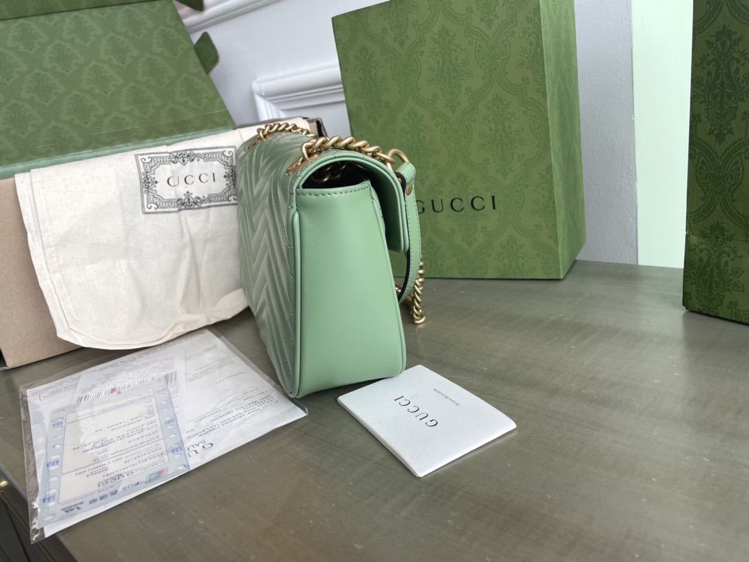 The softly structured shape of the small GG Marmont chain shoulder bag is defined by the antique gold-toned Double G hardware. The sliding chain strap can be worn multiple ways, changing between a shoulder and a top handle bag. Crafted in matelassé leather, it's enriched with curved patterns that play with fresh geometries.