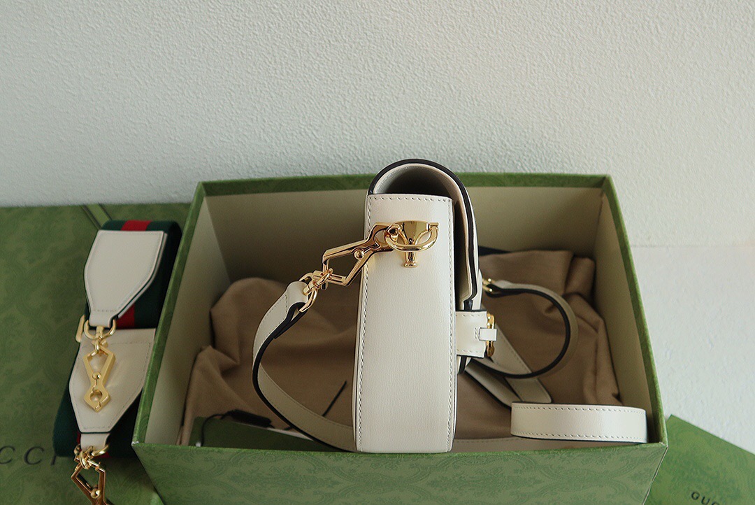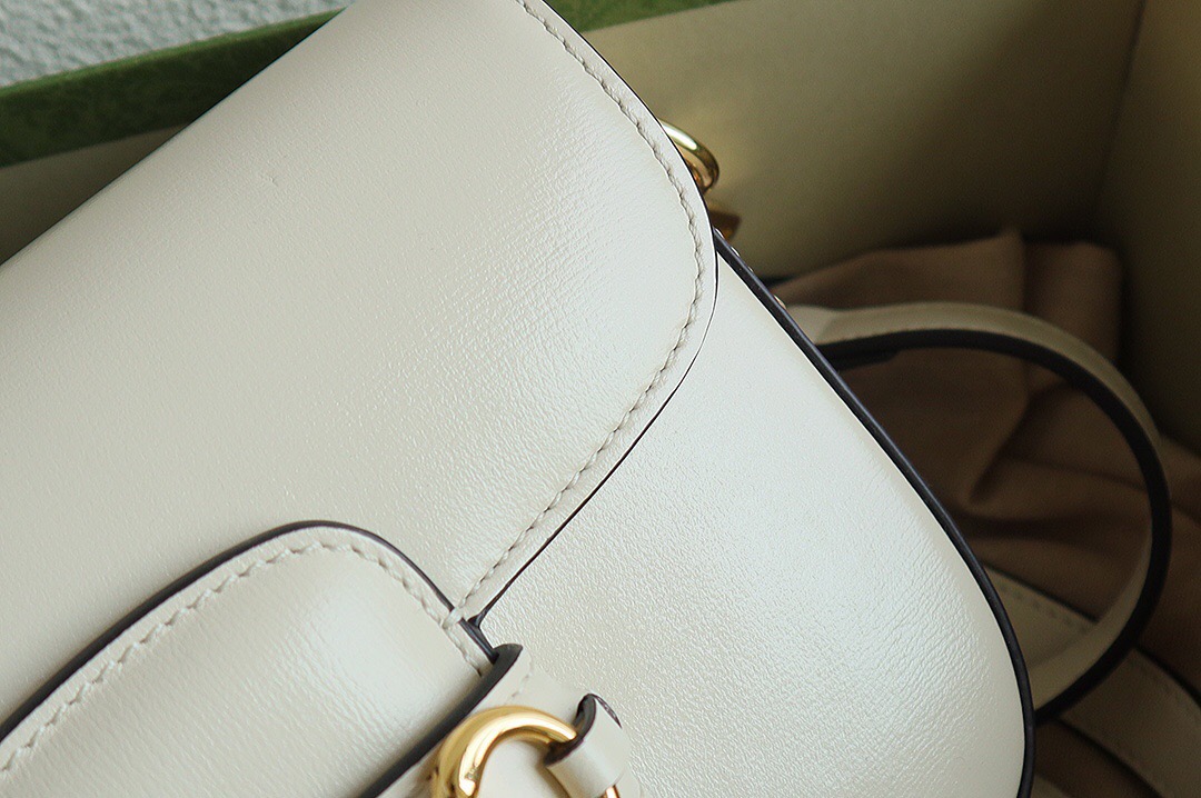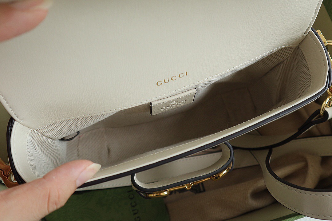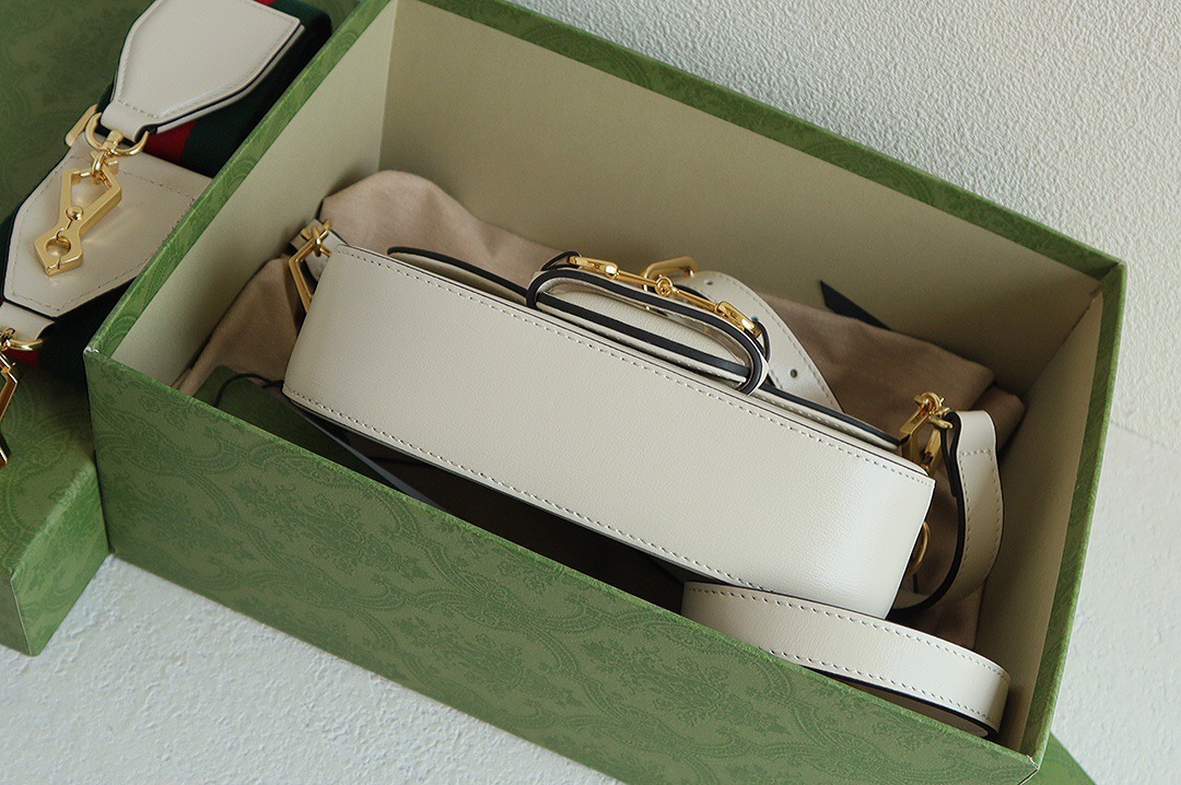 Petite versions of the Gucci Horsebit 1955 add a hybrid twist to the vintage inspired line. Enriched with two different shoulder straps, the black leather mini bag’s character transforms from understated elegance with a tonal leather strap to a strong logo feel thanks to a red and green Web option.