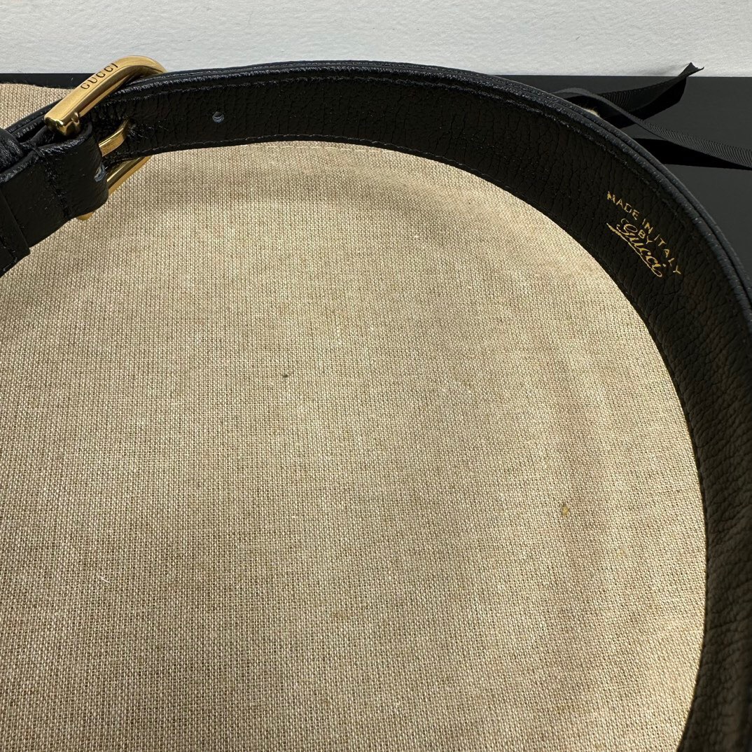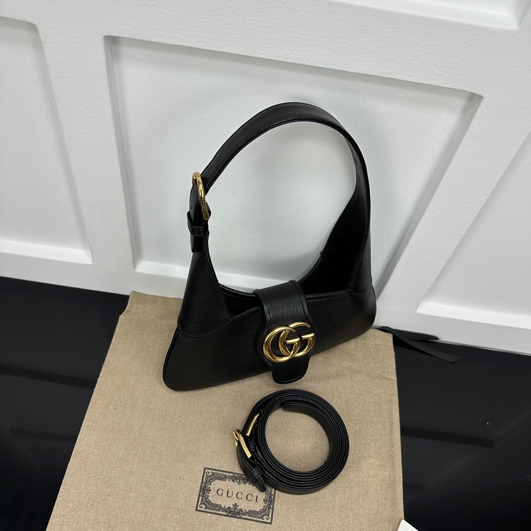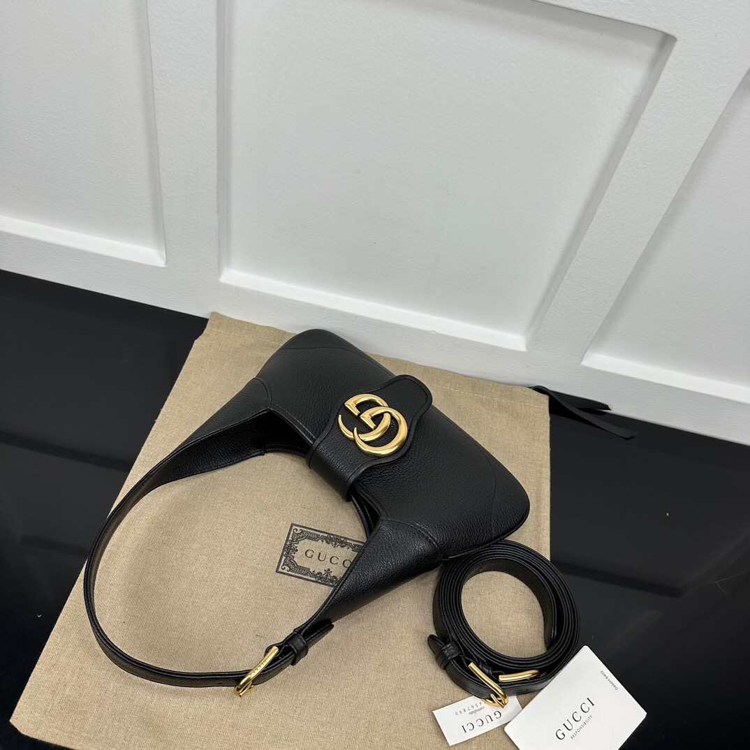 The Cruise 2023 Gucci Cosmogonie collection was presented against the backdrop of the historic Castel del Monte in Italy. The show brought together aesthetics from distant eras and geographies, and linked elements from the past with the present. This new crescent-shaped shoulder bag is part of a collection shown on the runway and was inspired by the House’s archives, it is crafted in soft leather and features the Double G emblem—a code originally introduced in the 1970s.