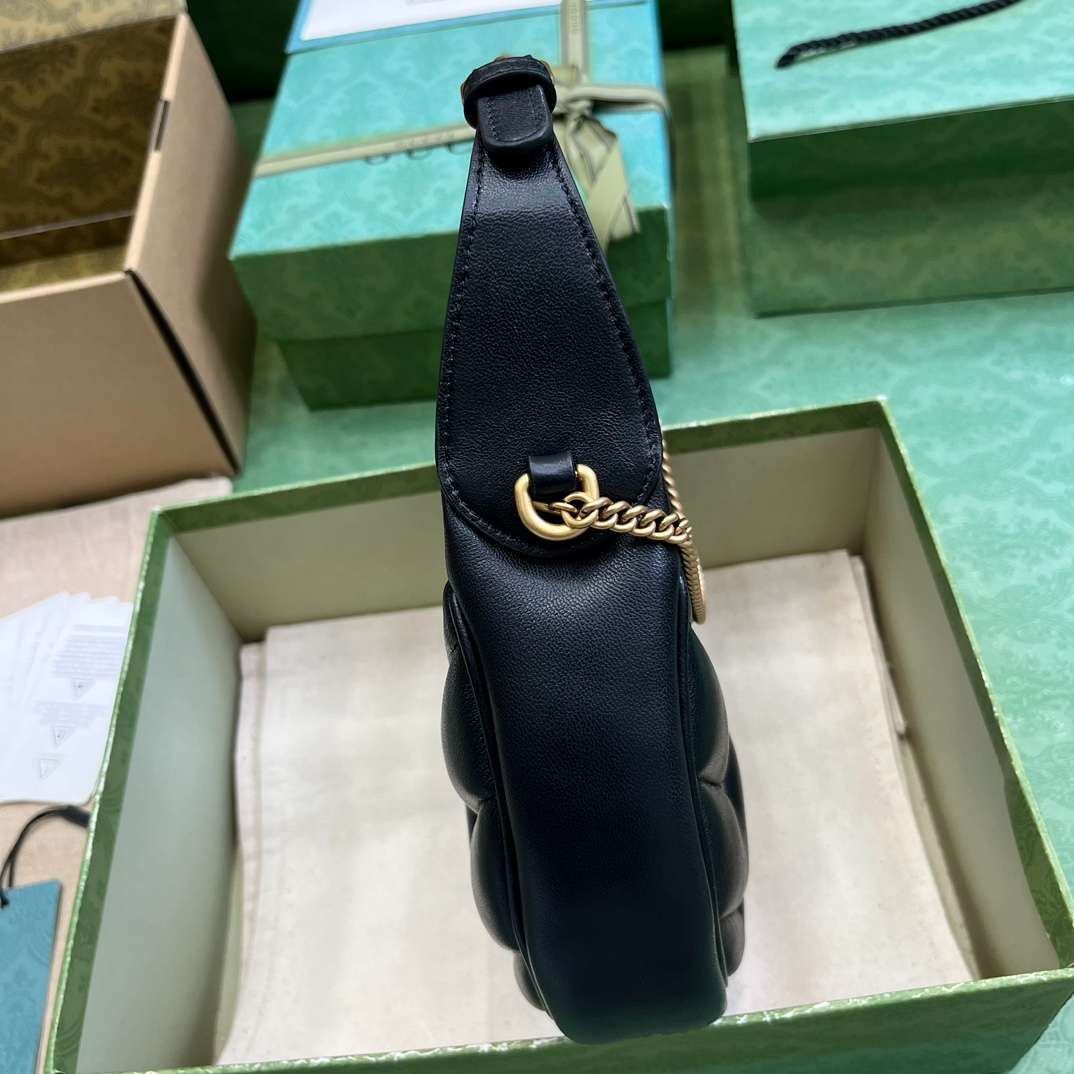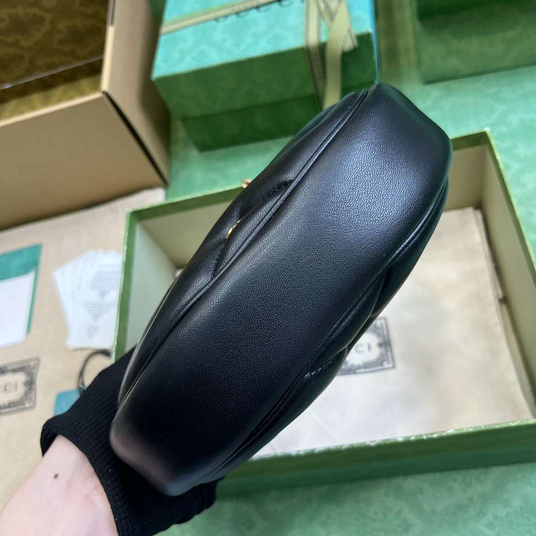 - This GG Marmont half-moon-shaped mini bag presents a softly quilted velvet version of the classic bag style, complete with small Double G studs. A tonal trim compliments the luxurious shade of black that heralds the beginning of a new season