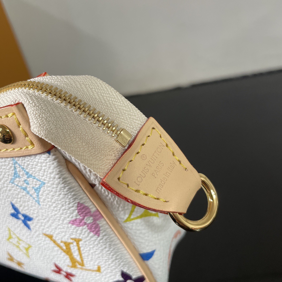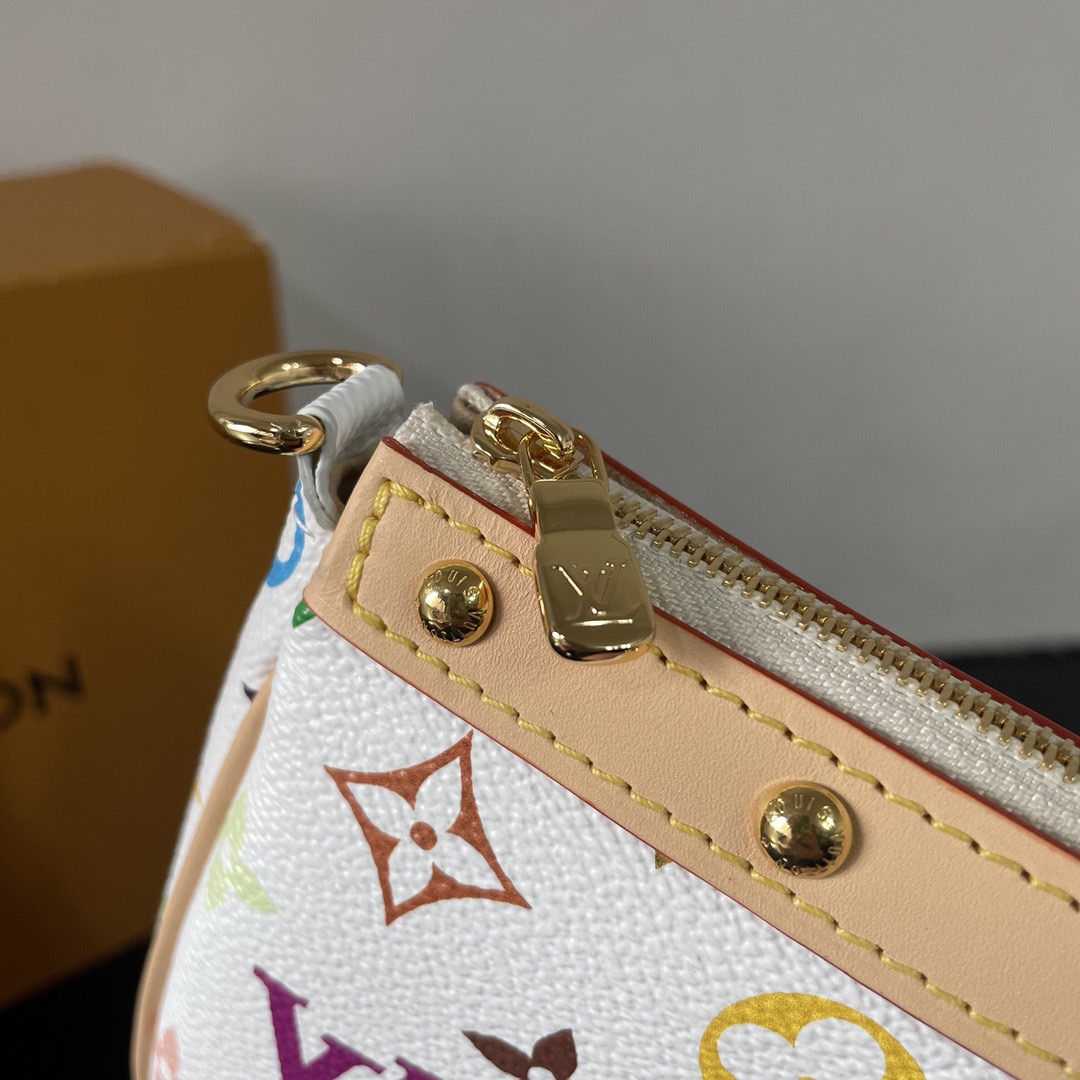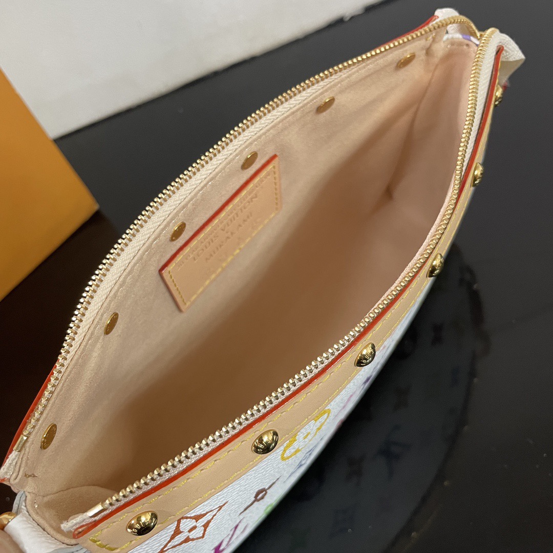 LOUIs vUITTON x Takashi Murakami Pochette Accessories Letter Logo Zipper Open and Close White Tri-Color Coated Canvas Leather Trim Mahjong Shoulder Bag Women's White with Light Brown