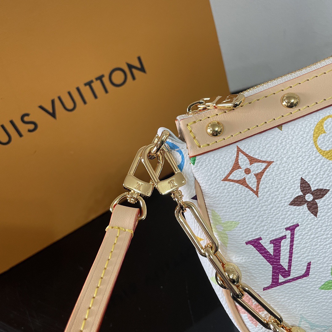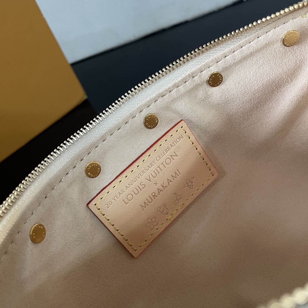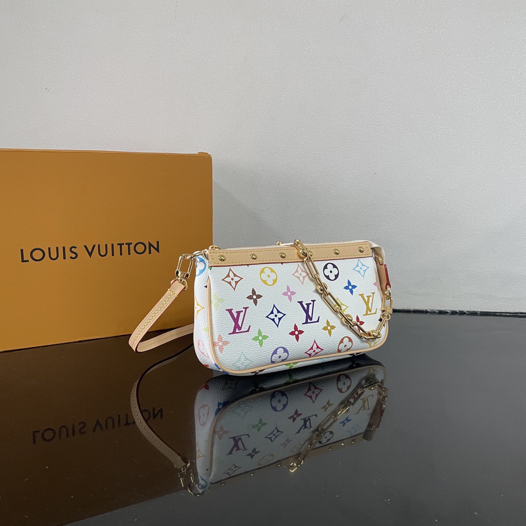 LOUIs vUITTON x Takashi Murakami Pochette Accessories Letter Logo Zipper Open and Close White Tri-Color Coated Canvas Leather Trim Mahjong Shoulder Bag Women's White with Light Brown