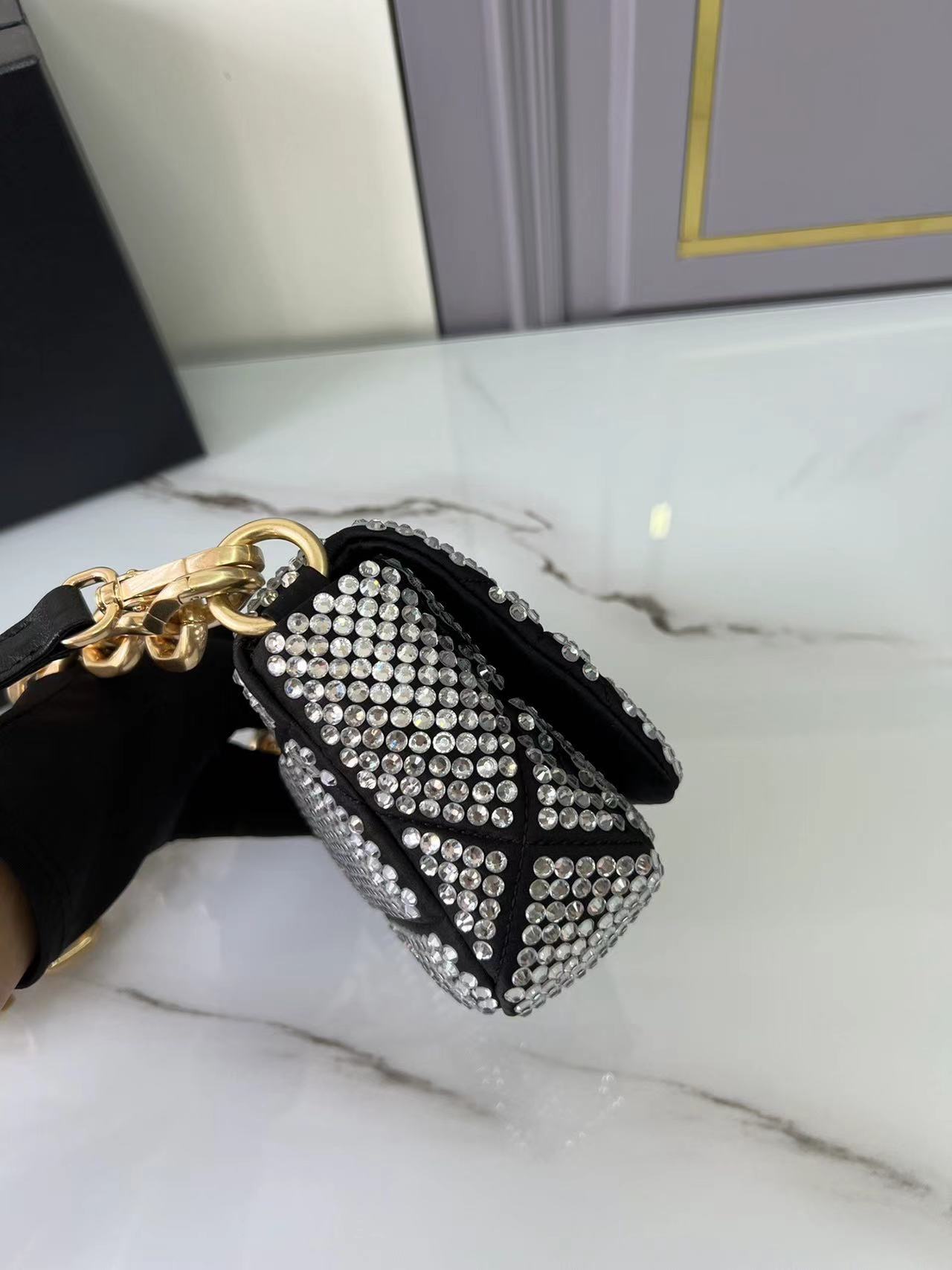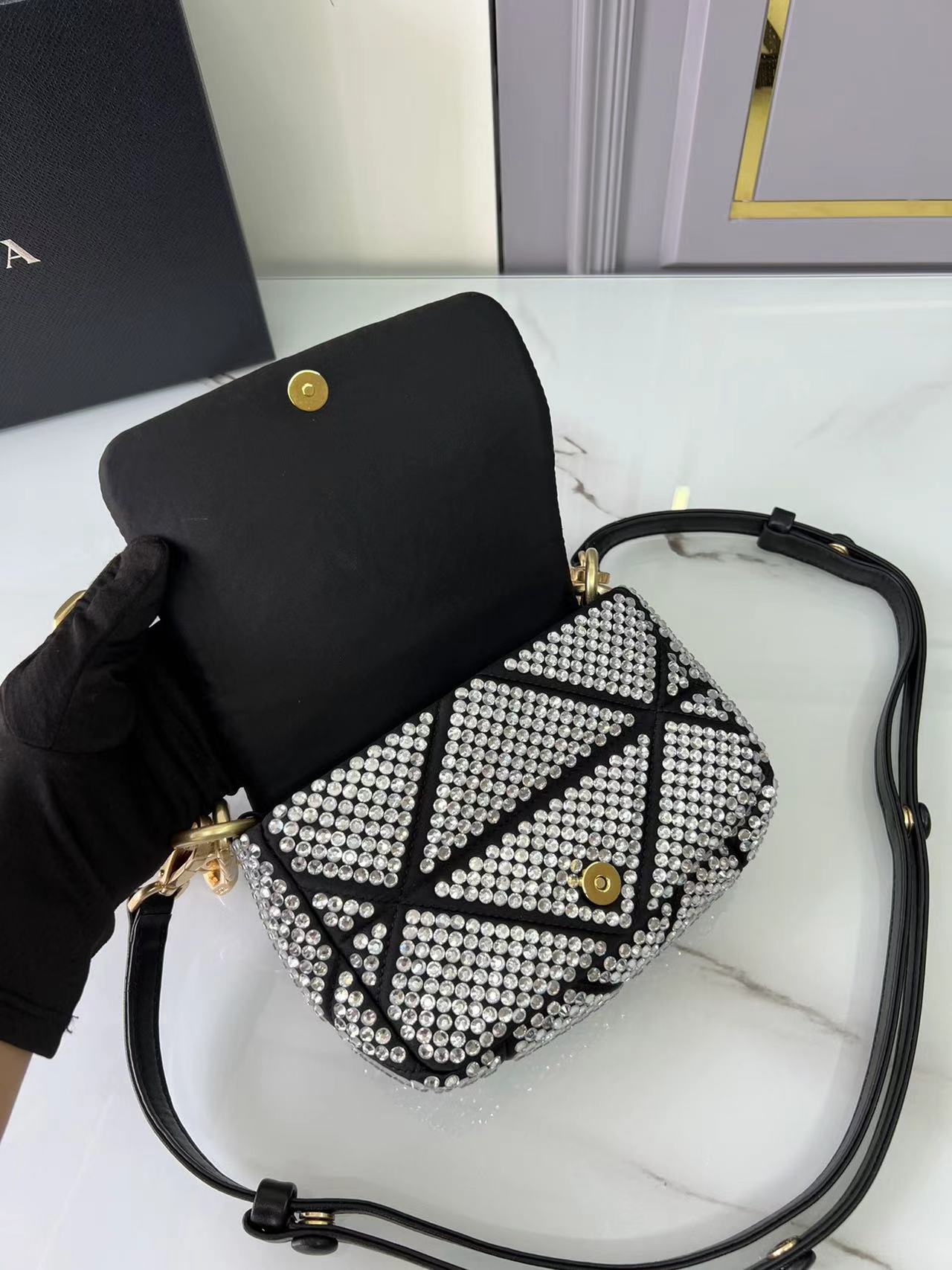 - With all-over synthetic crystals and top-stitching