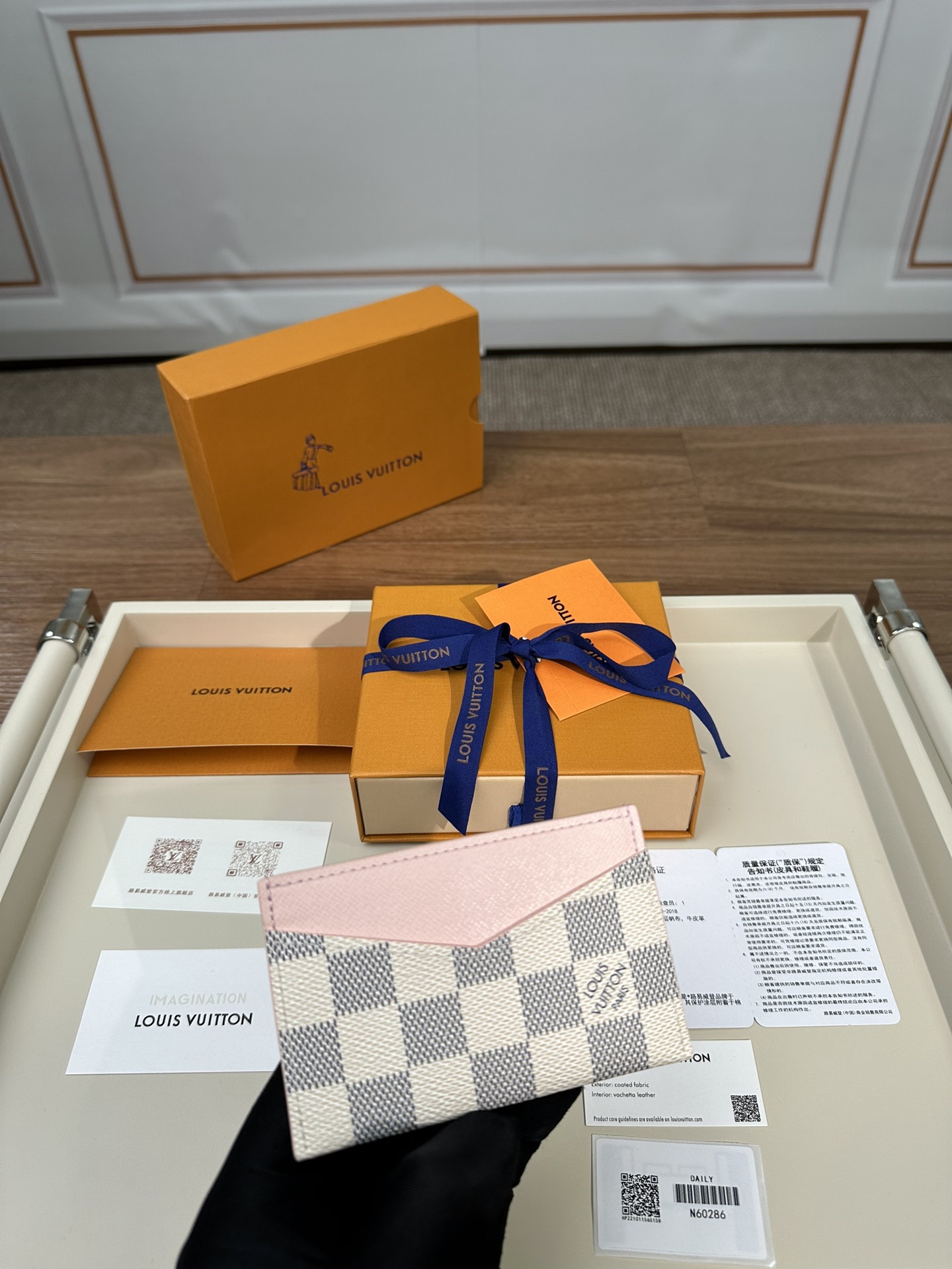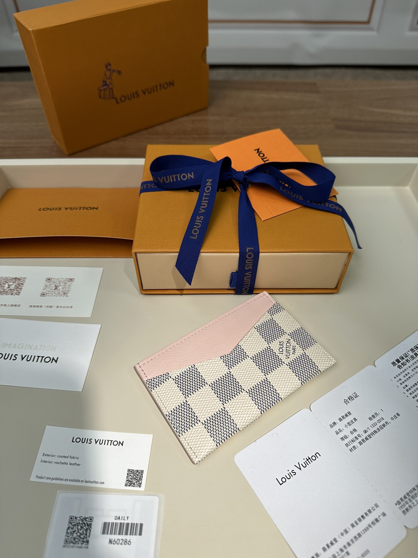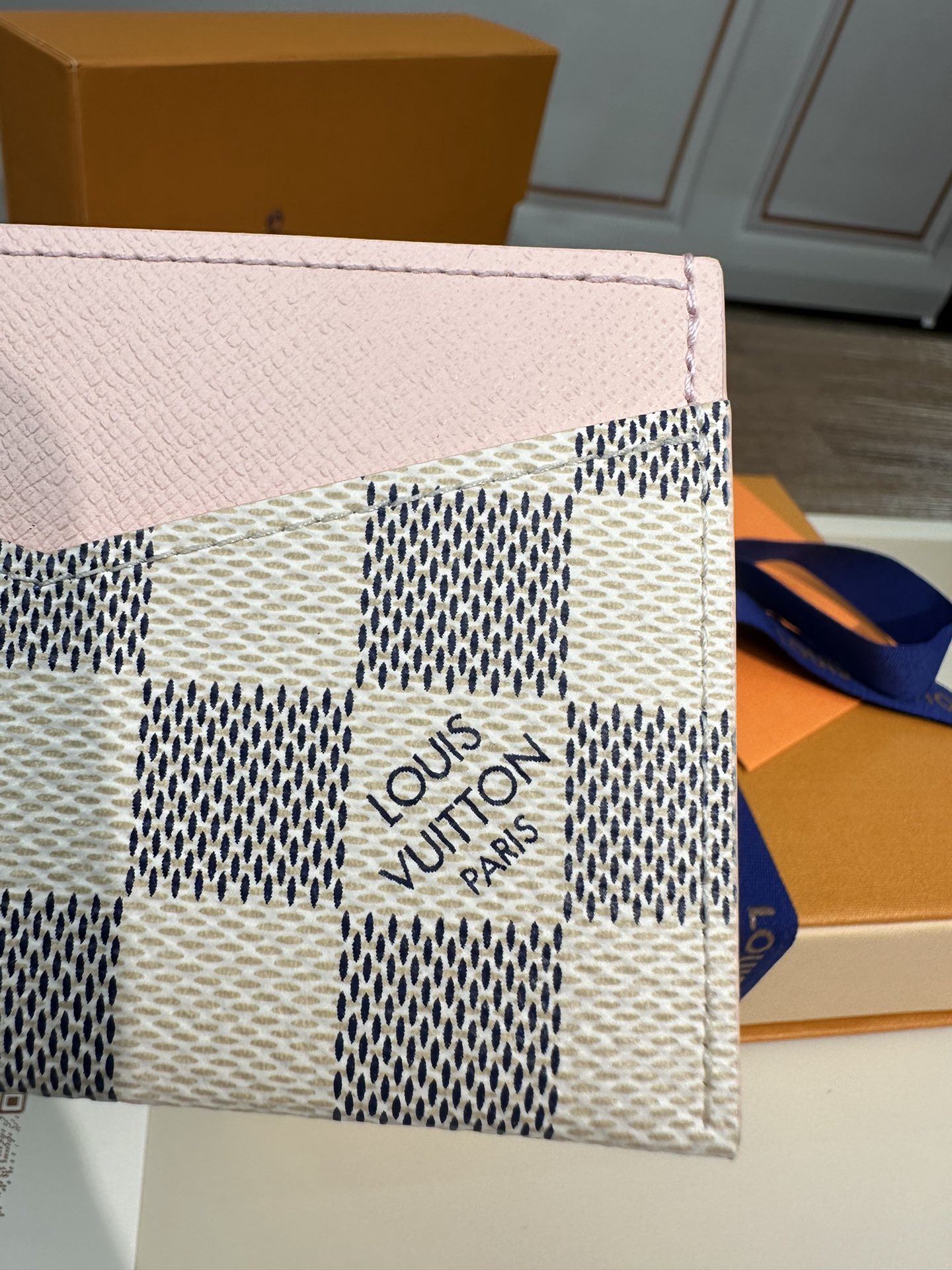 The Daily Card Holder is crafted from Damier Azur canvas with a distinctive V-shaped cutout on both sides revealing its colored leather lining. Small enough to fit into any pocket or bag, it offers two side slots and a larger central slot, which are ideal for credit cards, transport passes or business cards.