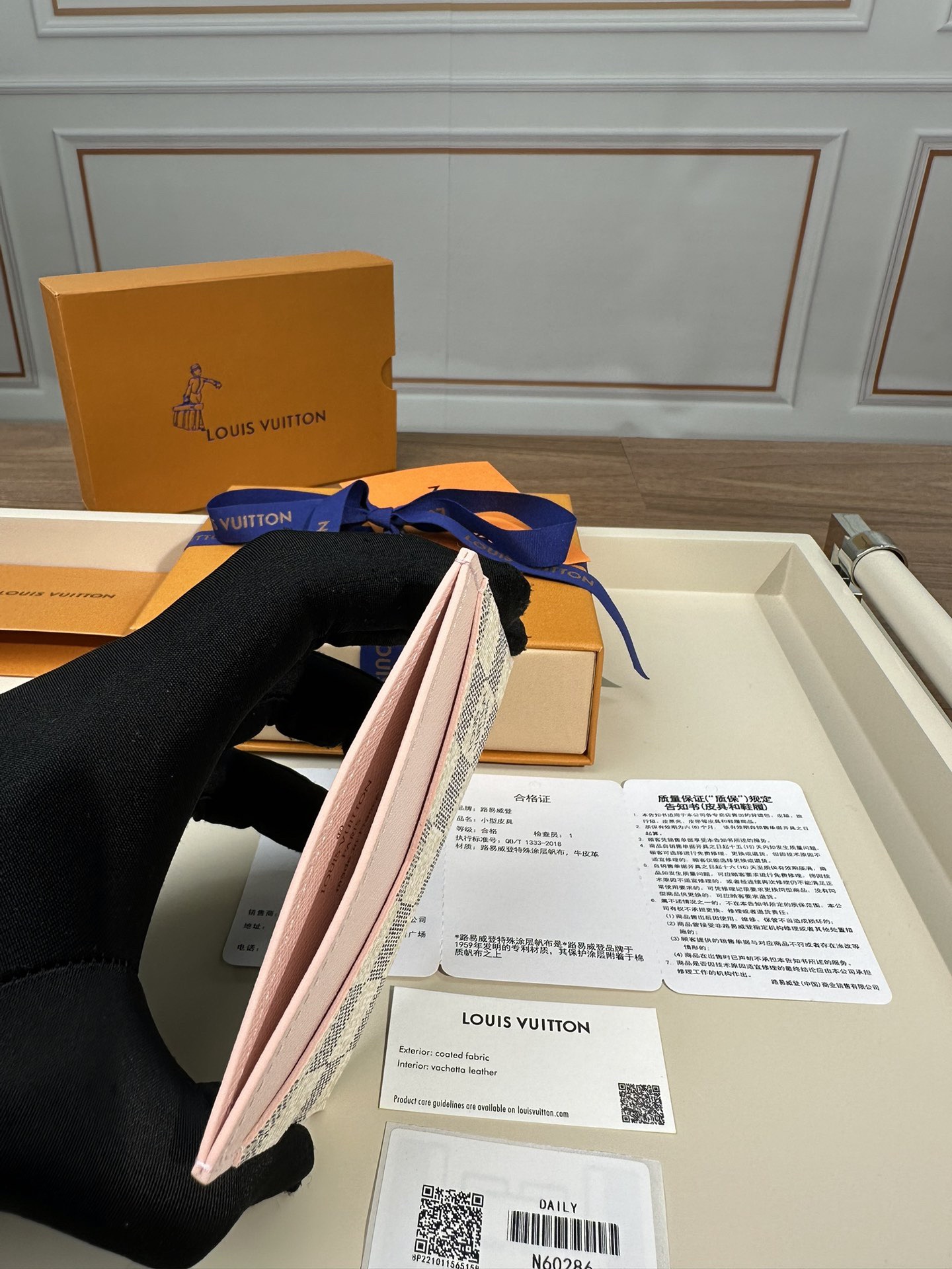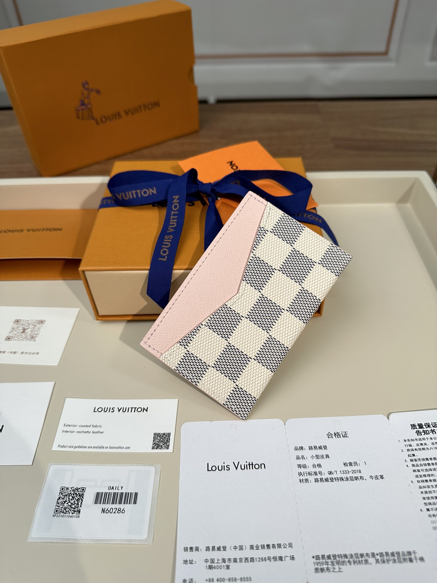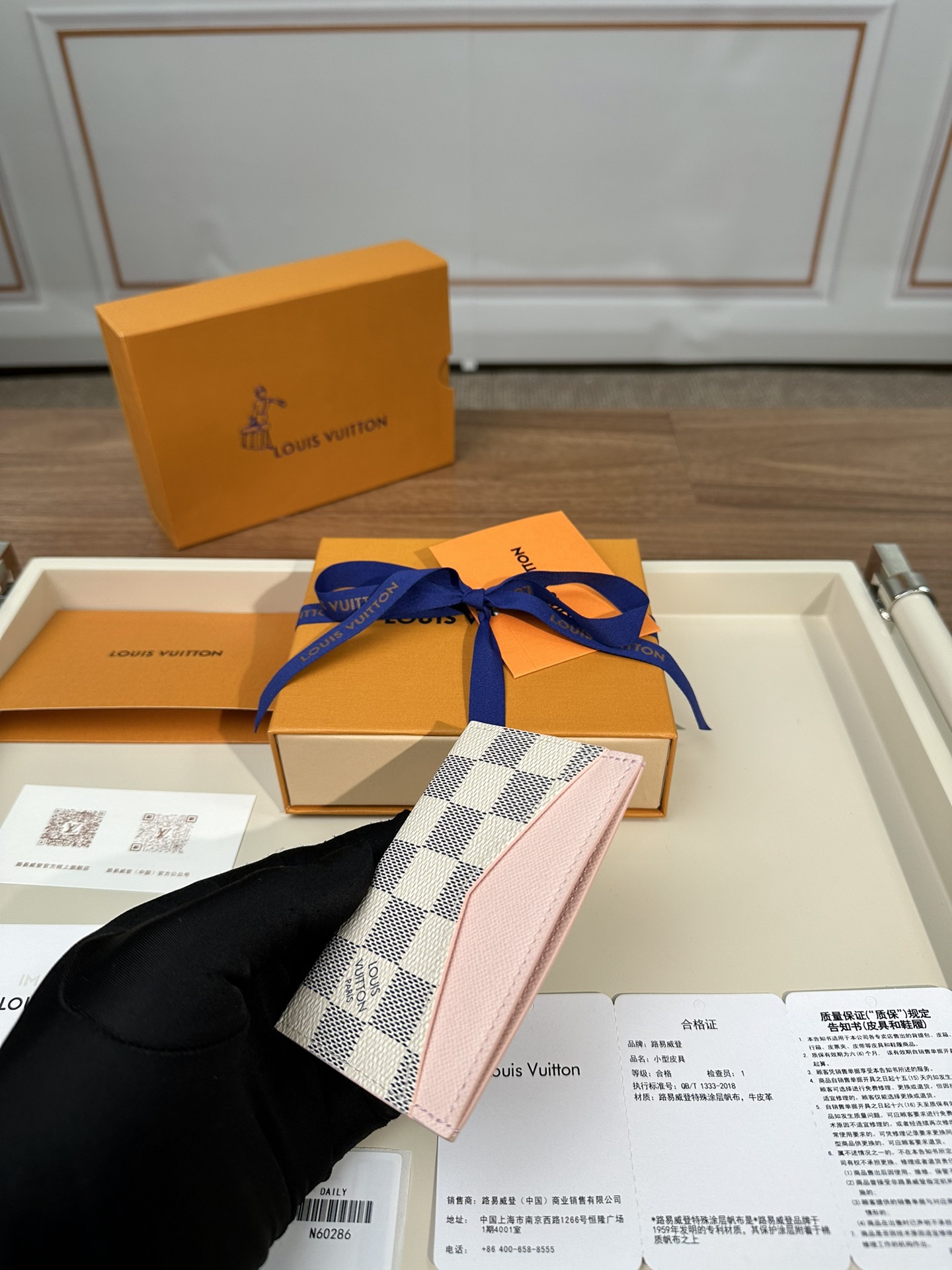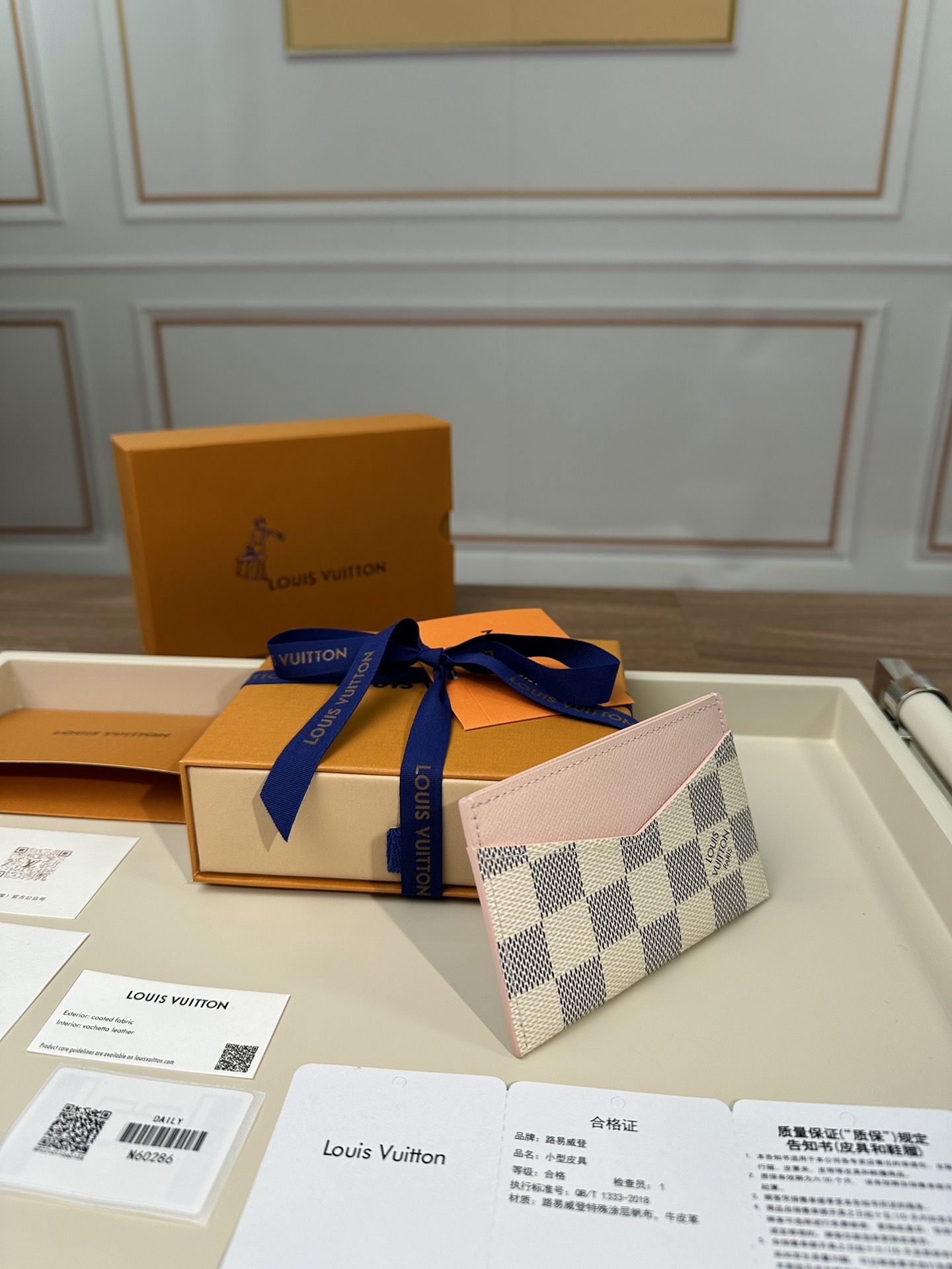 The Daily Card Holder is crafted from Damier Azur canvas with a distinctive V-shaped cutout on both sides revealing its colored leather lining. Small enough to fit into any pocket or bag, it offers two side slots and a larger central slot, which are ideal for credit cards, transport passes or business cards.