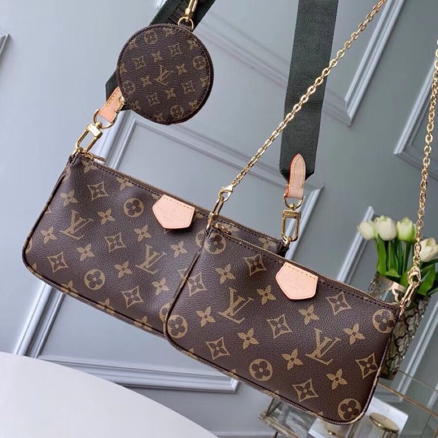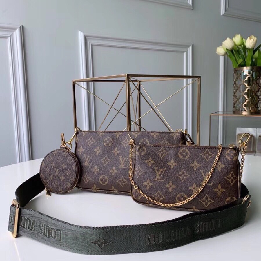 The Multi Pochette Accessoires is a hybrid cross-body bag with multiple pockets and compartments that brings together a Pochette Accessoires, a Mini Pochette Accessoires and a Round Coin Purse. Fashioned from Monogram canvas with a mini Monogram pattern on the sides of the two pochettes, it has both a removable gold-tone chain and an adjustable Louis Vuitton inscribed Jacquard strap for multiple carrying options.