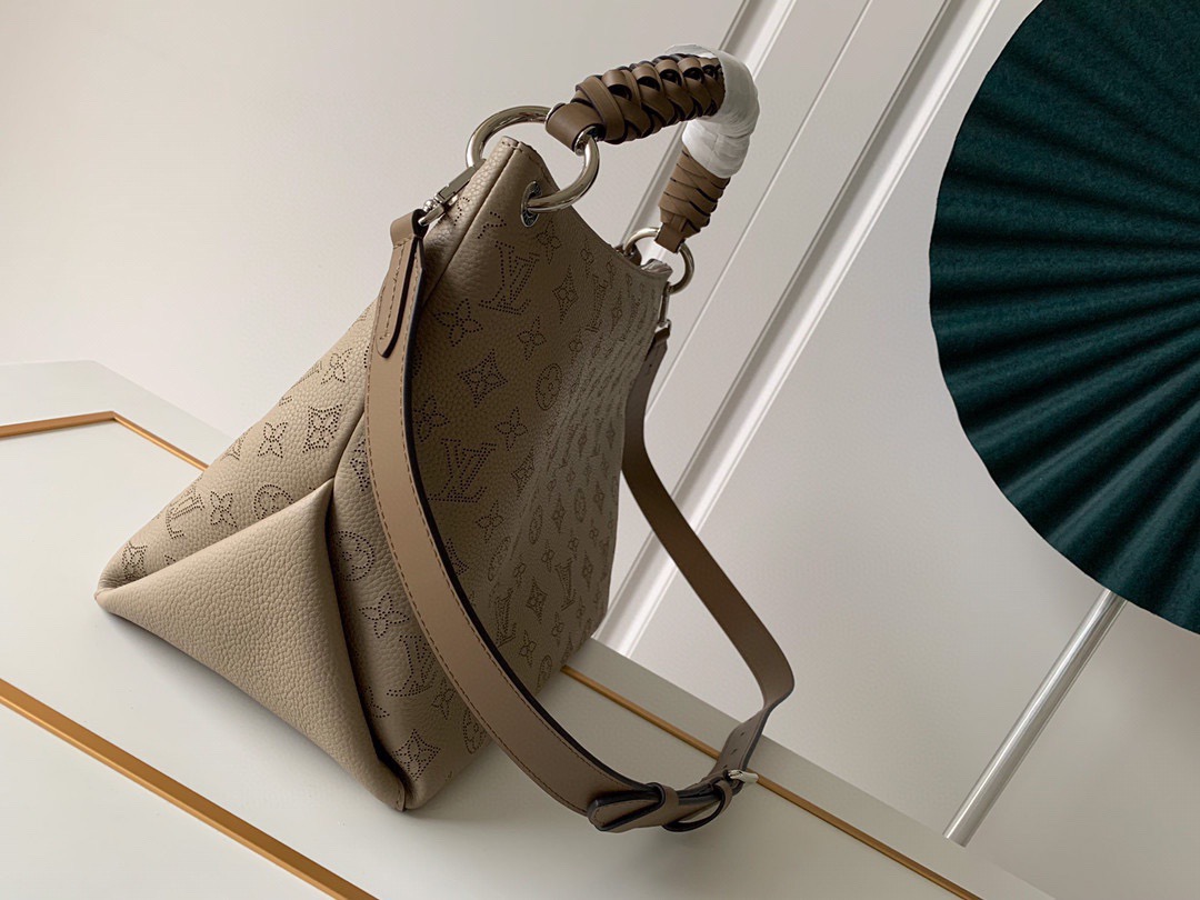 The Beaubourg Hobo MM bag is made from Mahina calf leather perforated with the Monogram pattern. It boasts a stylishly braided-leather top handle, with hand-painted edge-dyeing along the braids. The leather zip pulls and large LV charm sign the bag. A detachable, wide leather strap means that this supple bag feels comfortable against the body.