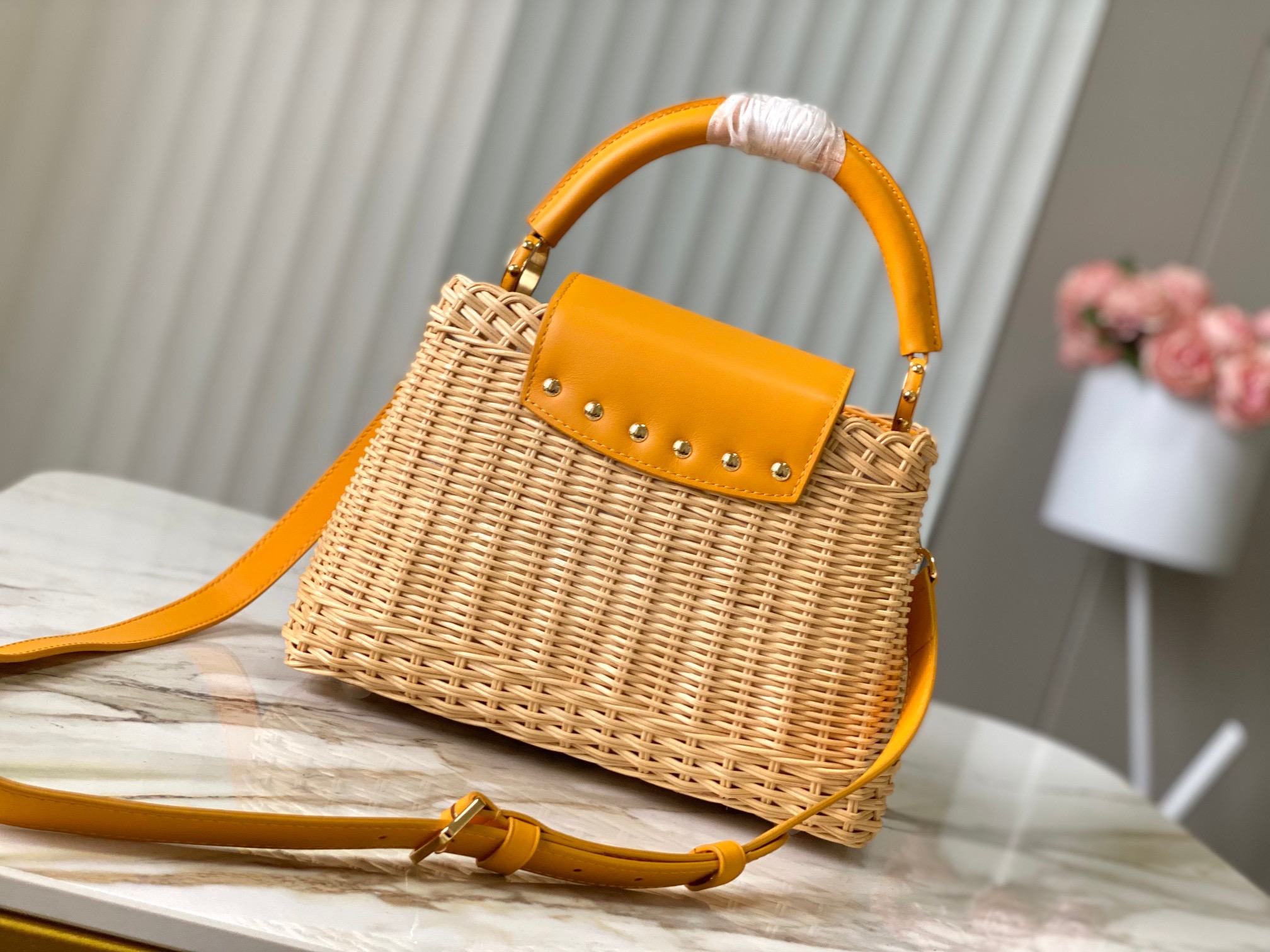 LOUIS VUITTON Capucines BB letter logo Detachable Adjustable strap Braided leather Single Shoulder Crossbody Tote Small Women's Natural color with orange