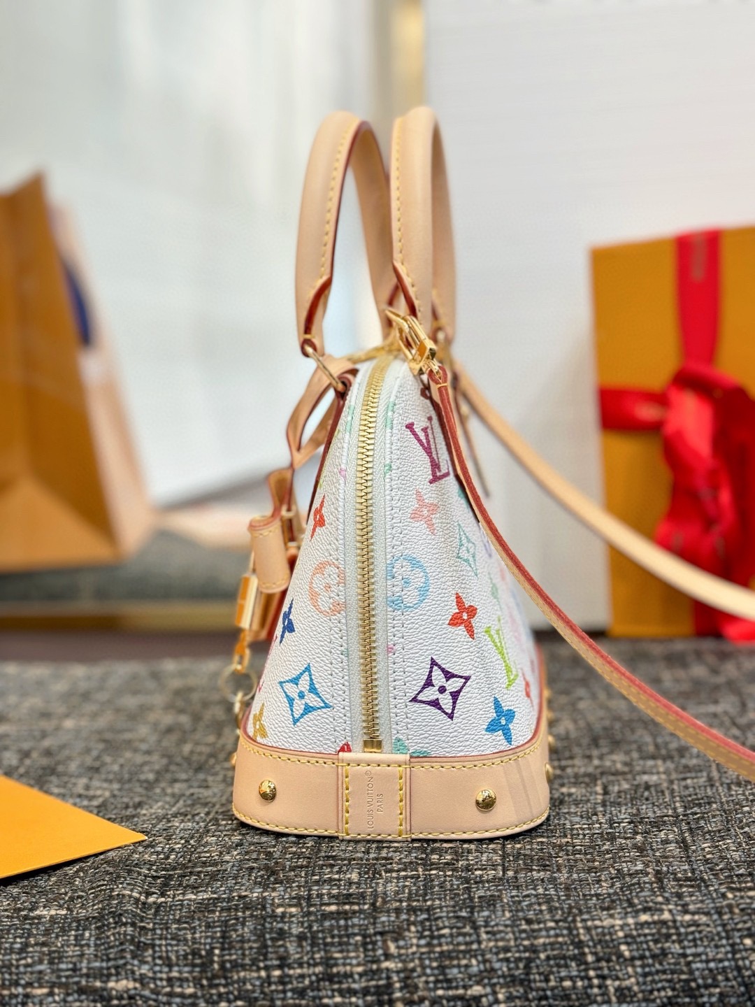 LoUIs vUITTON x Takashi Murakami Alma Adjustable removable Shoulder strap Zipper Open and close White three-color Monogram coated canvas shell 売 Crossbody Handbag Small women's White