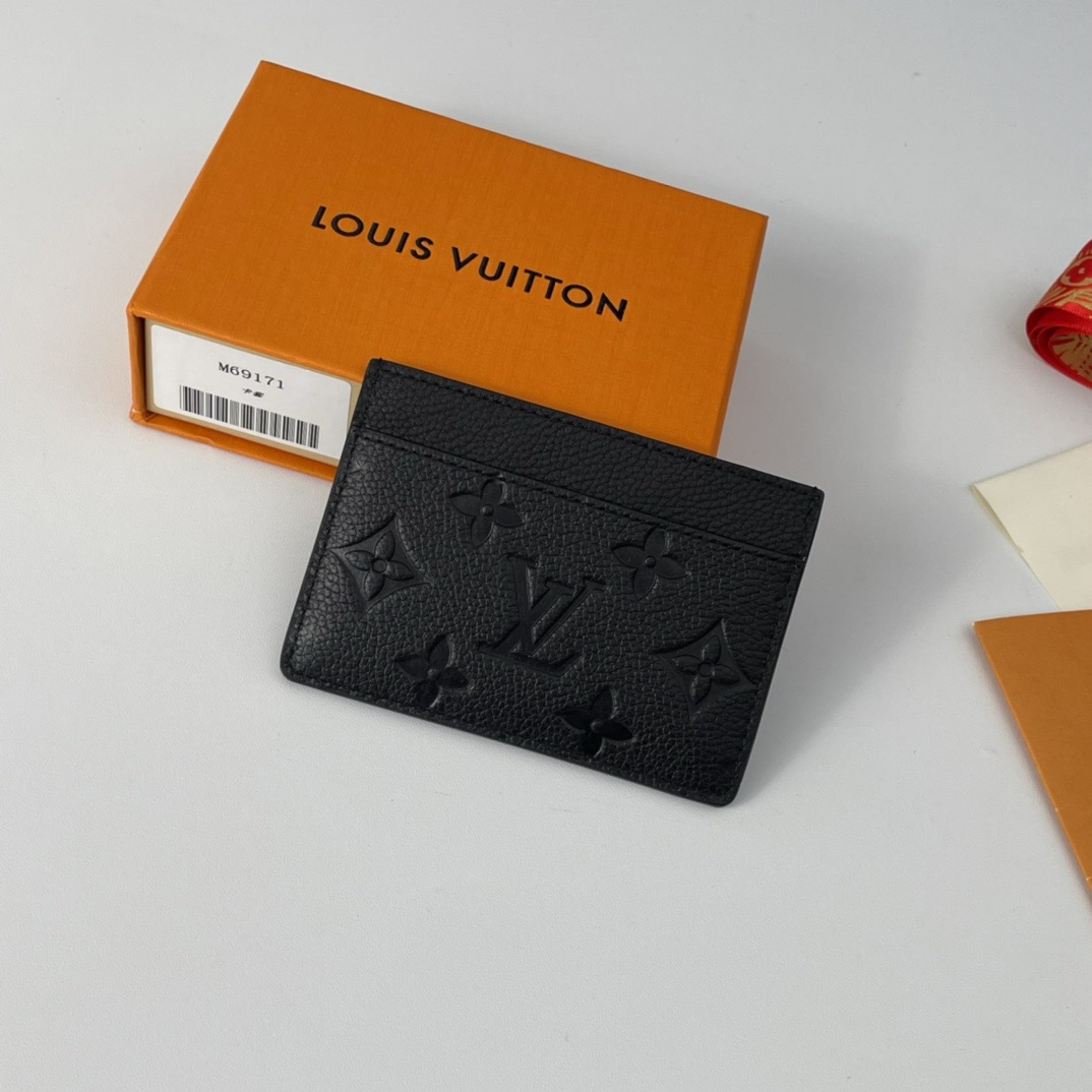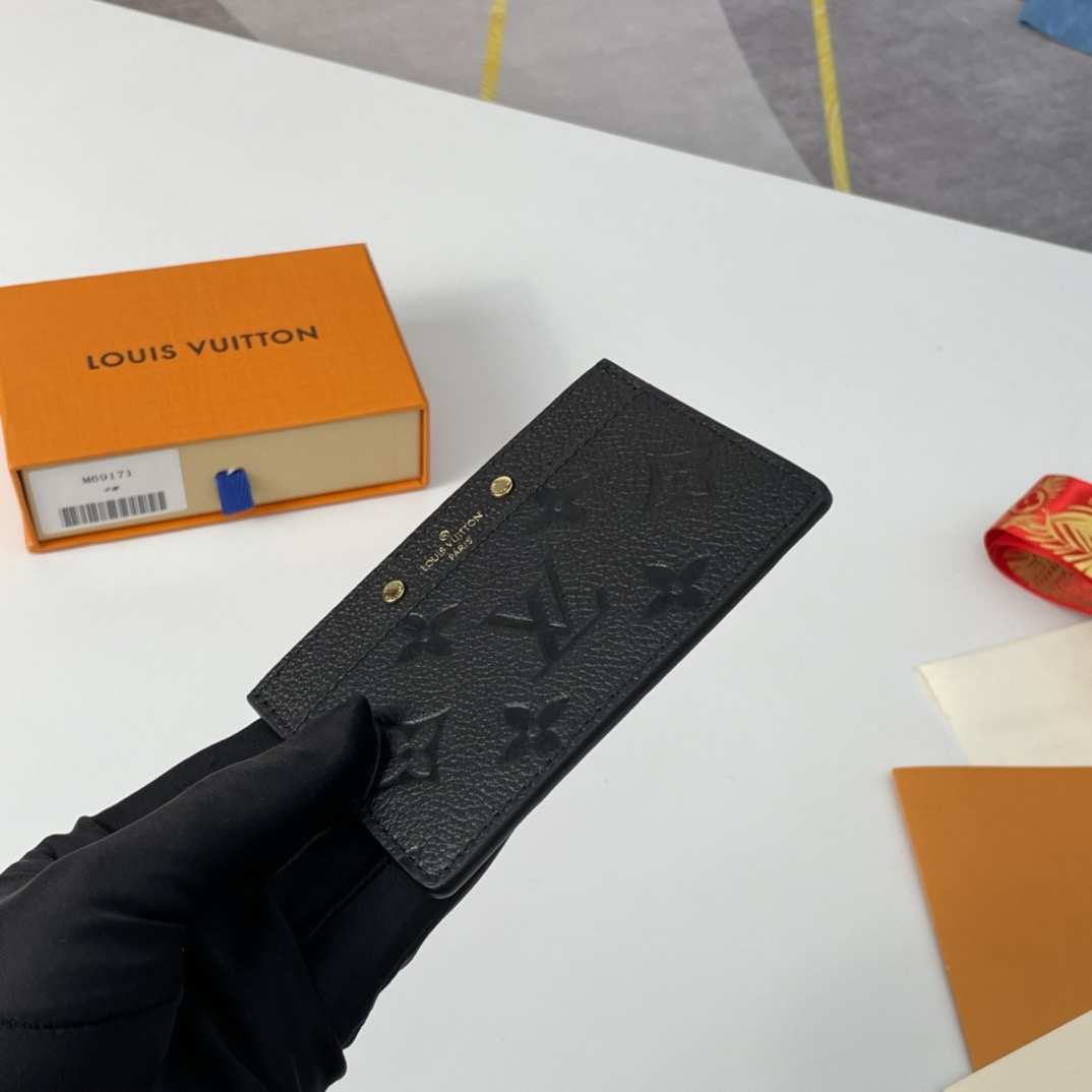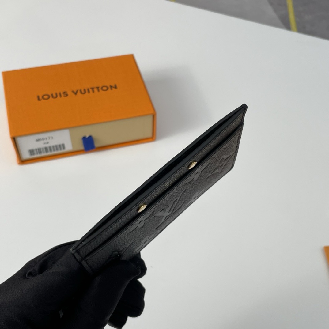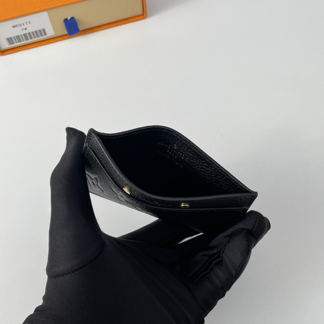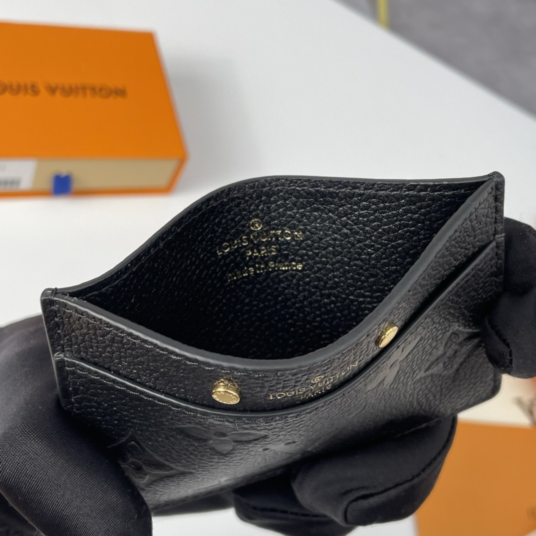 Louis Vuitton's classic Card Holder is given a feminine twist in Monogram Empreinte leather, discreetly embossed with the iconic Monogram pattern. This essential accessory, which slips into any pocket or bag, is ideal for carrying credit, business or transport cards. It is embossed with the House signature, flanked by two gold-tone studs.