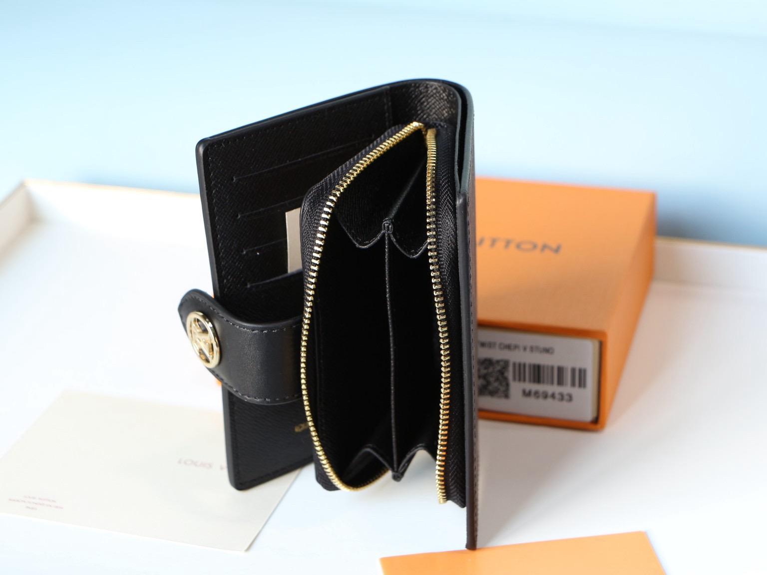 The Juliette wallet is crafted from iconic Monogram canvas, complemented by a distinctive front pocket in Monogram Giant Reverse canvas. This perfect medium-size compact wallet offers four card slots, a pocket for bills and a zipped coin compartment within its space-efficient format. It closes with a gold-color LV Circle press-stud.