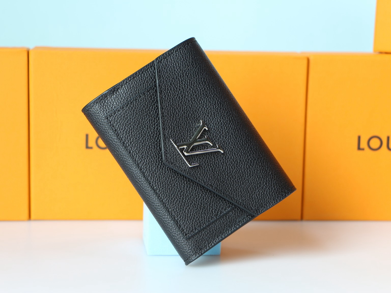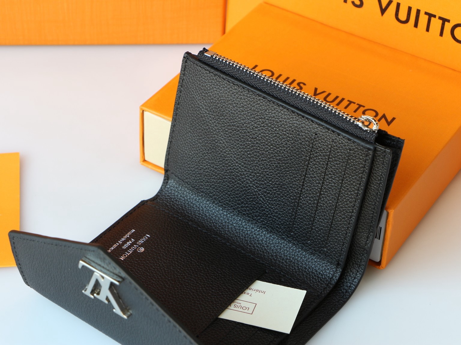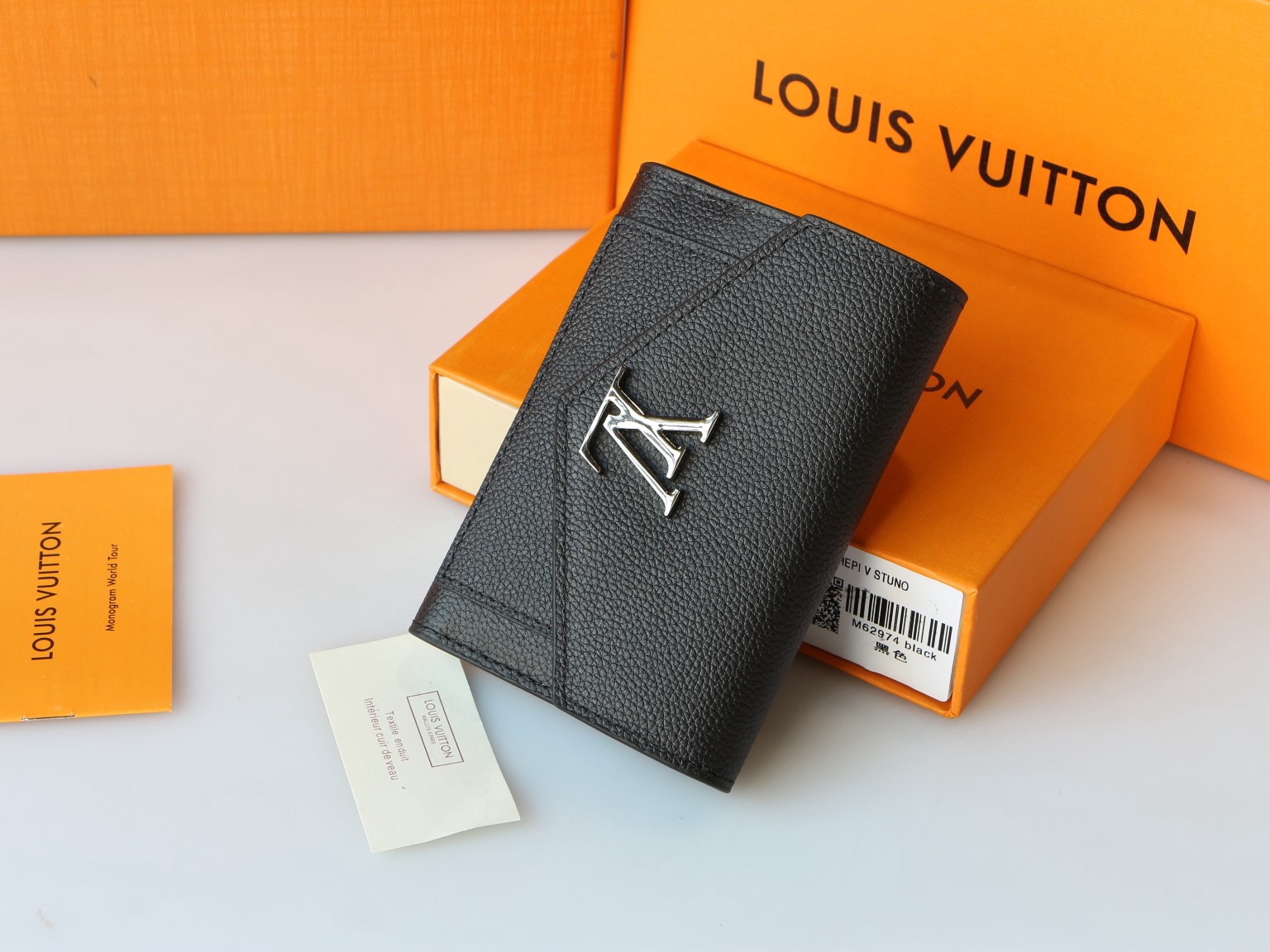 The Mylockme compact wallet in supple calf leather references the key signatures of the Lockme handbag: the envelope-style flap, the front pocket and the LV Initials accessory. Small enough to fit into any Lockme bag, this space-efficient design offers an array of pockets and credit card slots, including a zipped pocket for coins.