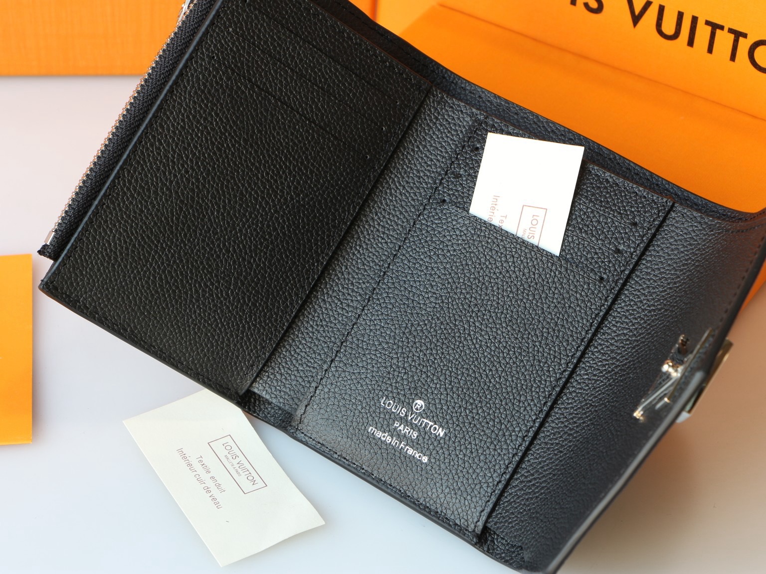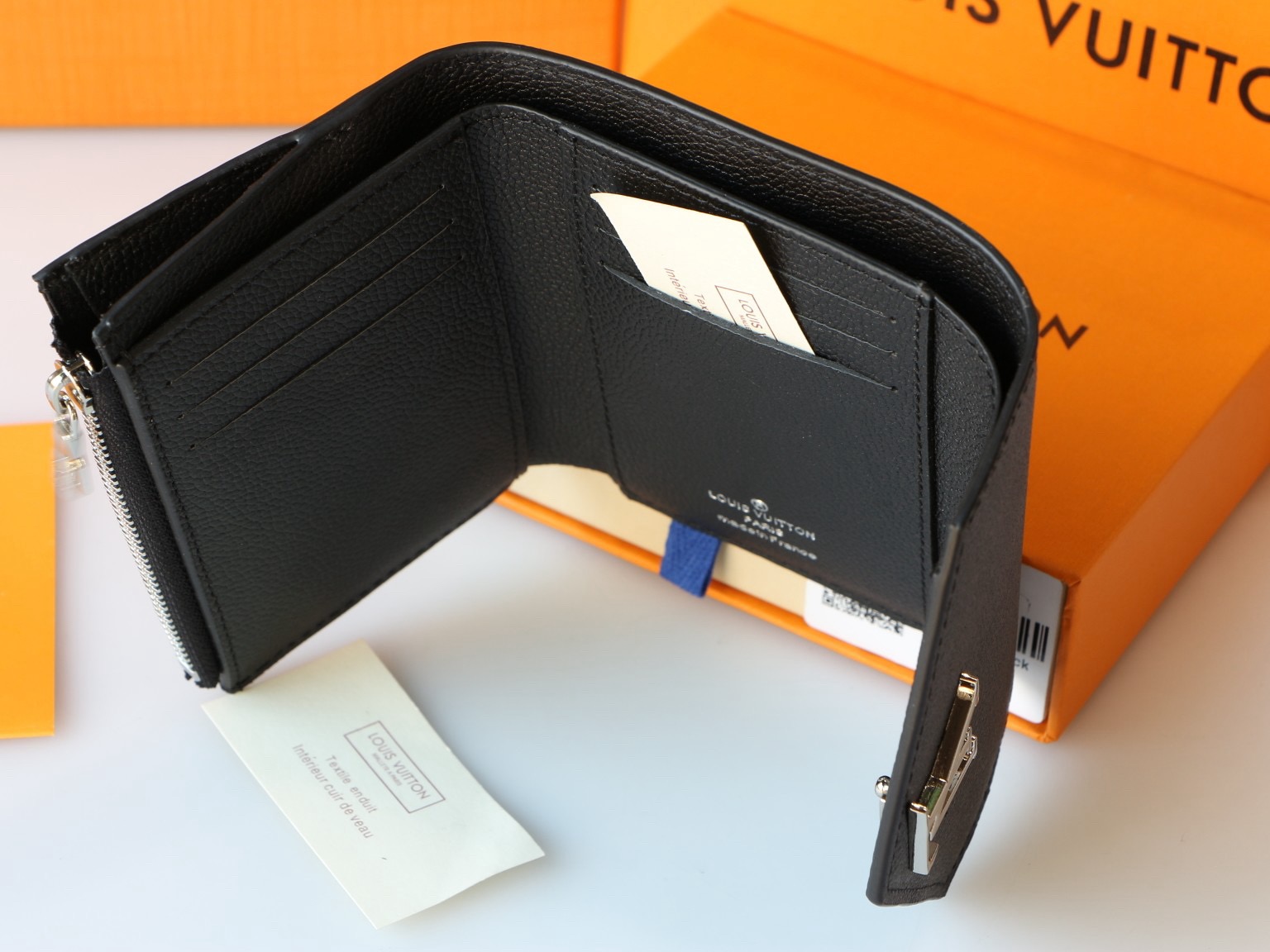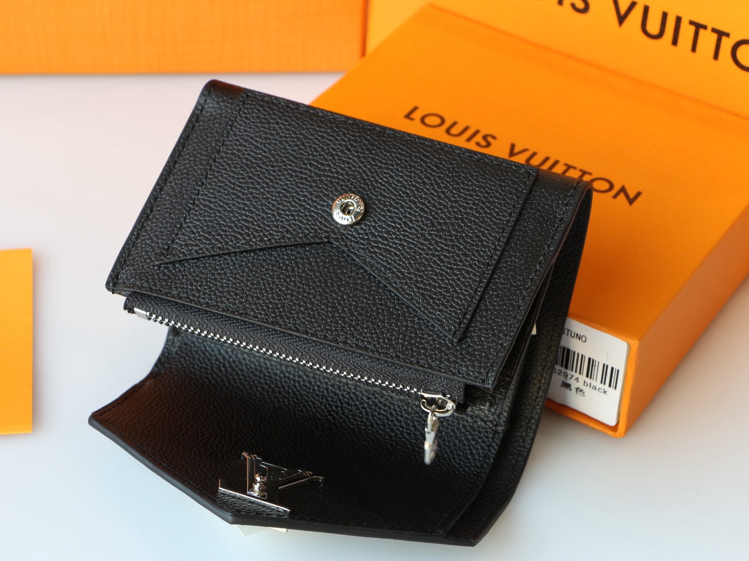 The Mylockme compact wallet in supple calf leather references the key signatures of the Lockme handbag: the envelope-style flap, the front pocket and the LV Initials accessory. Small enough to fit into any Lockme bag, this space-efficient design offers an array of pockets and credit card slots, including a zipped pocket for coins.