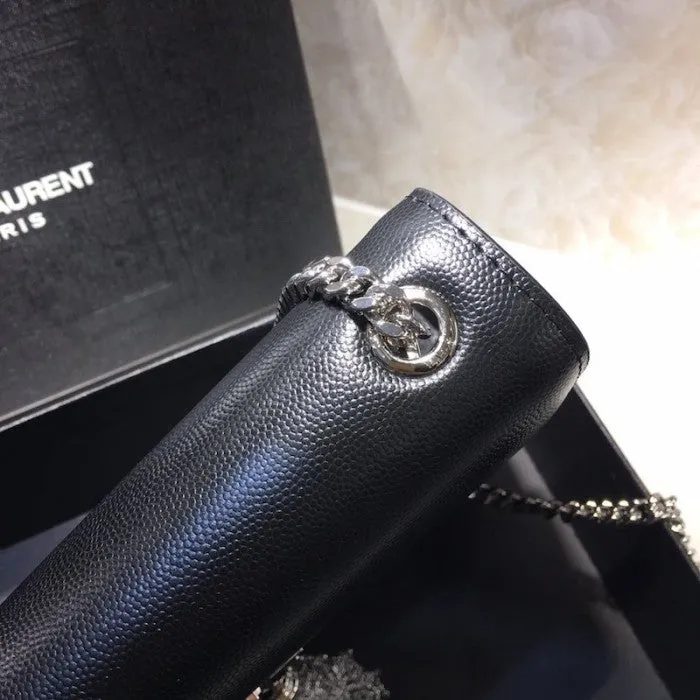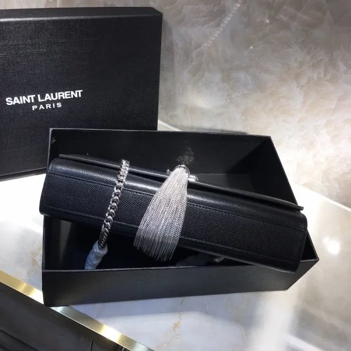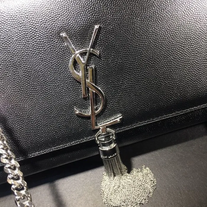 BAG WITH FLAP DECORATED WITH A TASSEL AND METAL Y INITIALS AND FEATURING A CHAIN SHOULDER STRAP.